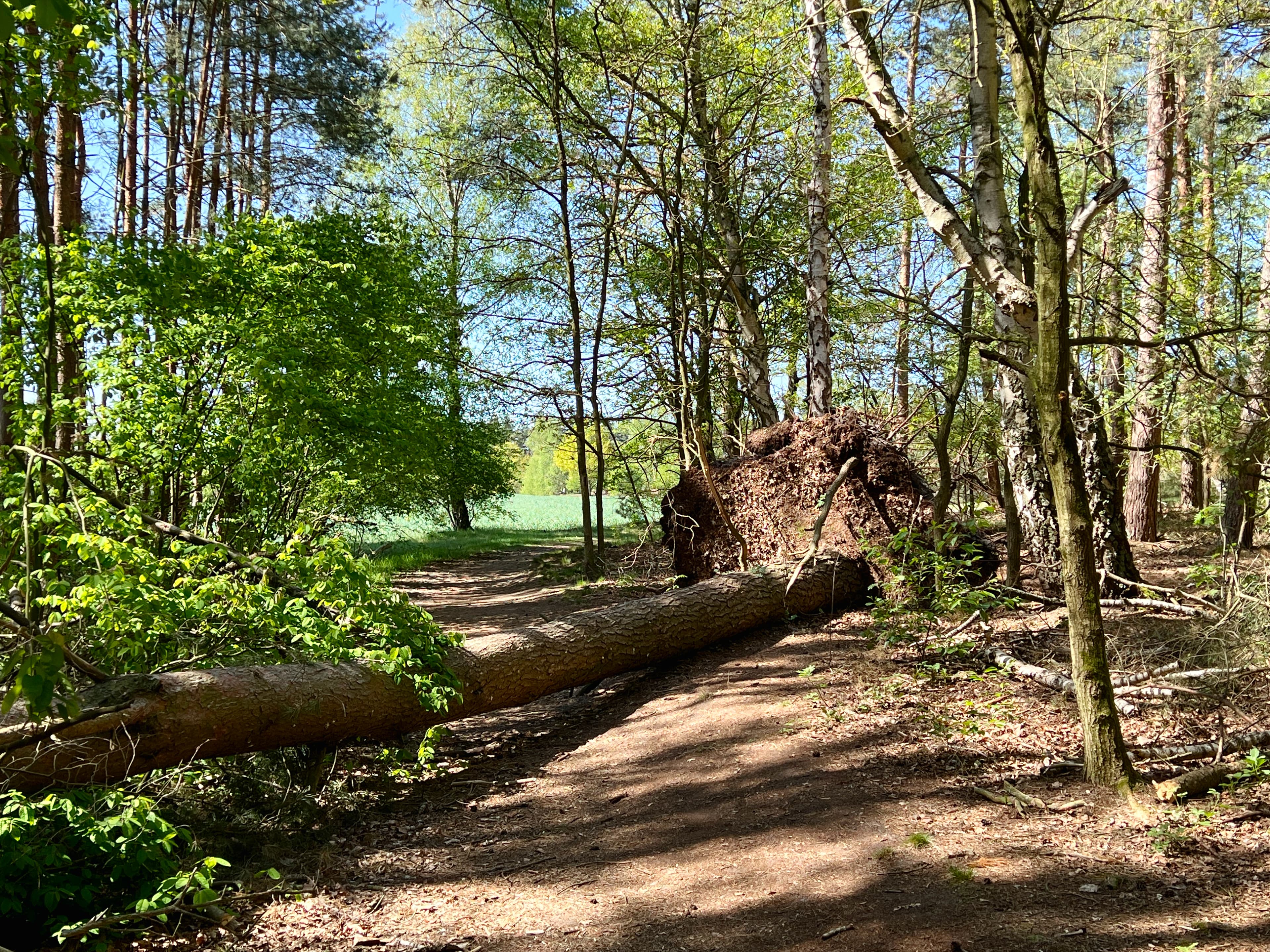 Auf der Bank am Löns-Stein geniesse ich meinen mitgebrachten Kaffee , ein Brötchen zur Stärkung und dann kann ich losgehen. Die Wegmarkierungen kenne ich ja bereits von meiner Tour auf der Heideschleife Radenbachtal (Zur Erinnerung: Diese Tour stand schon zur Wahl für Deutschlands schönsten Wanderweg in der Kategorie Tageswanderung) .Auf dem sehr gut markierten Weg komme ich nach kurzer Zeit in einen dichten, schattigen Nadelwald. Gute Wegbeschaffenheit, ab und zu muss ich über einen umgestürzten Baum steigen oder eine versperrte Stelle umlaufen. Es handelt sich offensichtlich um Sturmschäden aus dem Frühjahr an deren Beseitigung aber augenscheinlich gearbeitet wird/wurde. Kein Problem also!