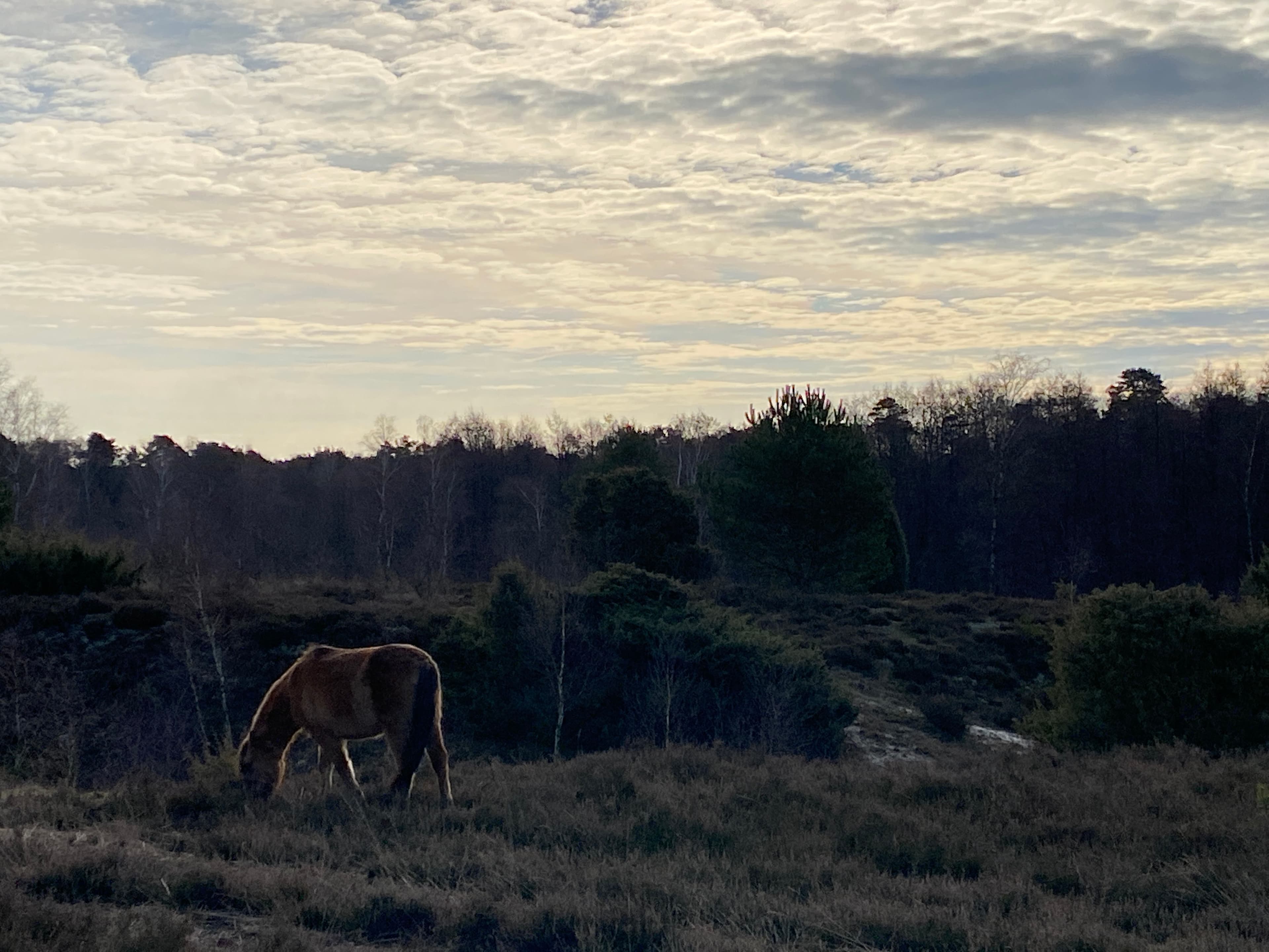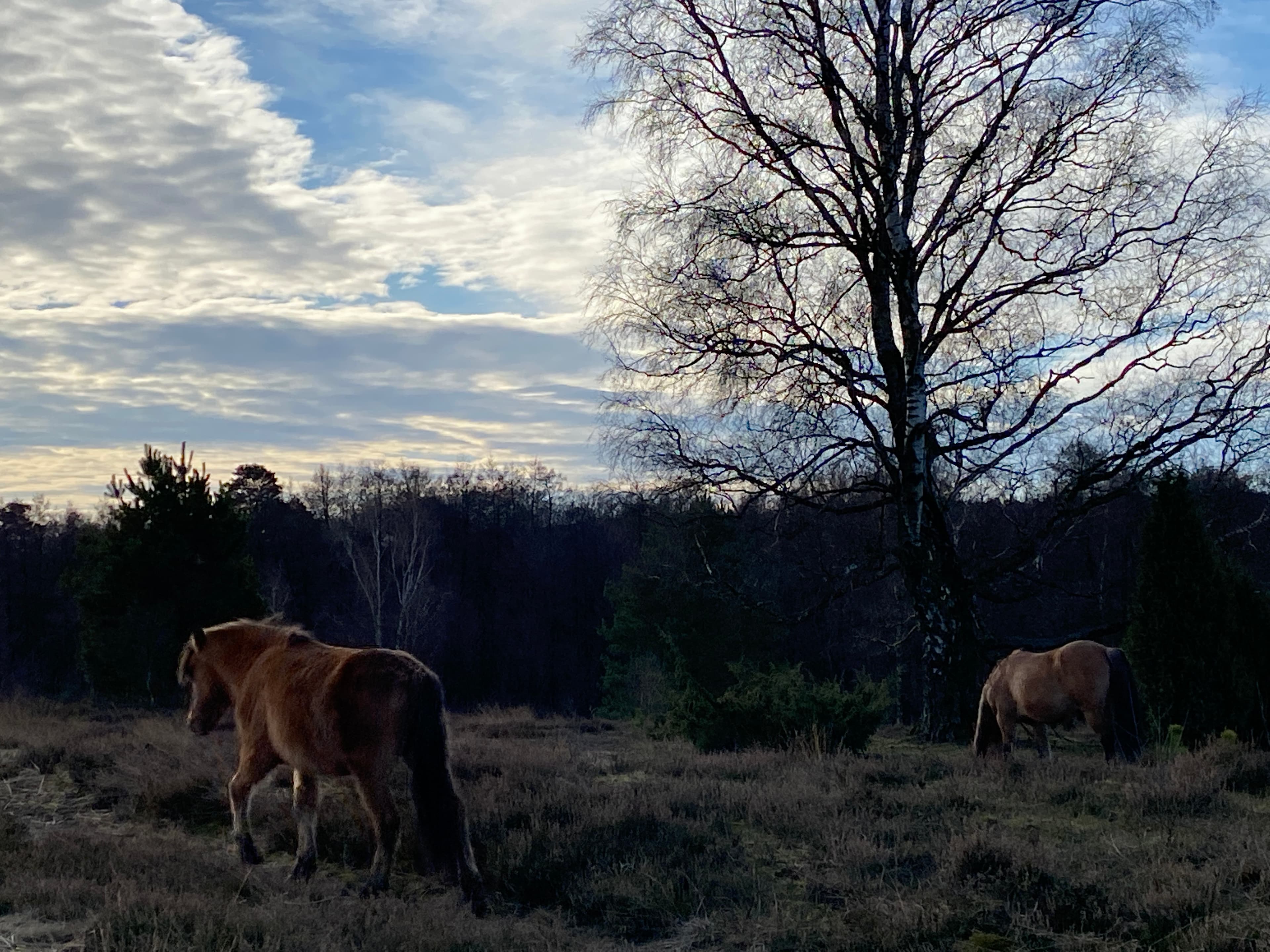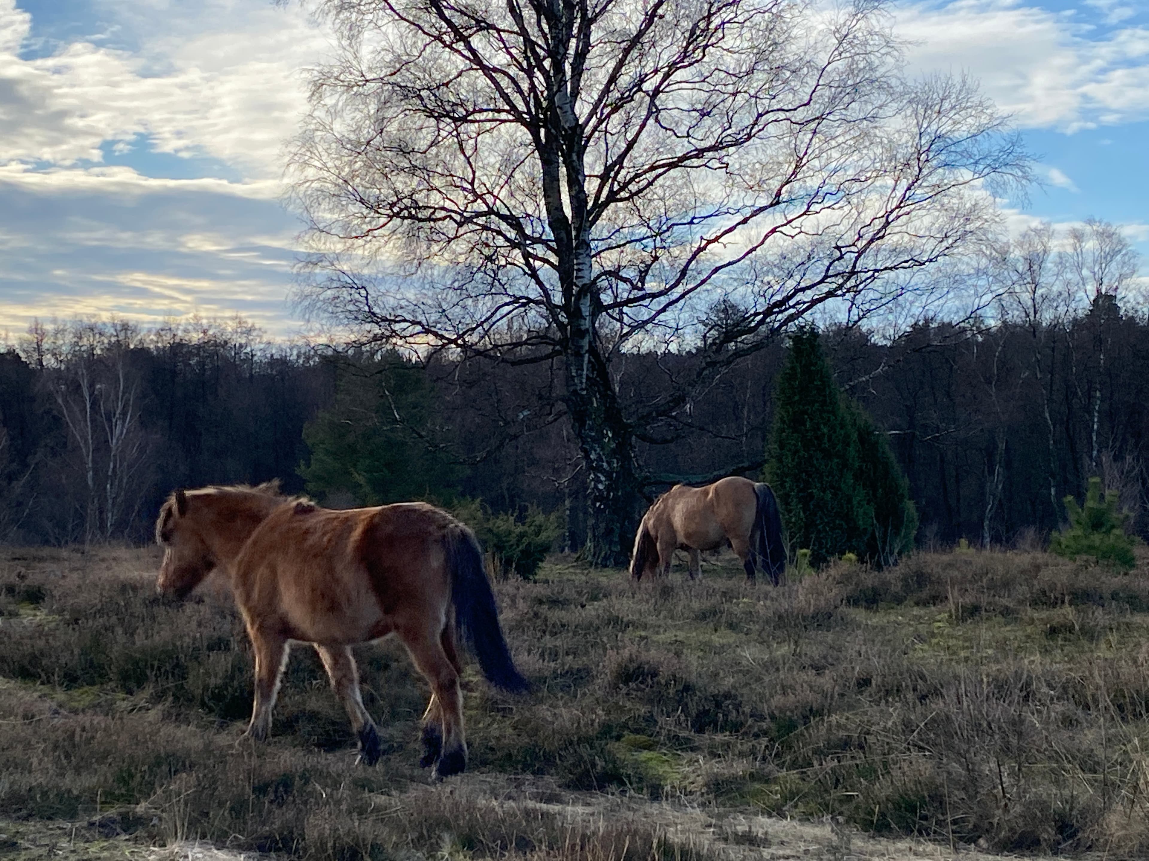 Mein Blick geht in die Weite des Talgrundes zu meiner Rechten. Aber warum in die Ferne schauen? Direkt neben mir entdecke ich zwei Vierbeiner, die in aller Ruhe frühstücken. Ich habe wirklich nicht damit gerechnet Dülmener Pferden zu begegnen und freue mich um so mehr. Die Beiden gehen langsam auf Distanz, lassen sich aber nicht bei der Nahrungsaufnahme stören. Wirklich ein sehr schönes Erlebnis und ich stelle mir die Tiere in einer blühenden Heidelandschaft vor…Ganz klarer Entschluss: Hier muss ich zur Heideblüte wieder hin.