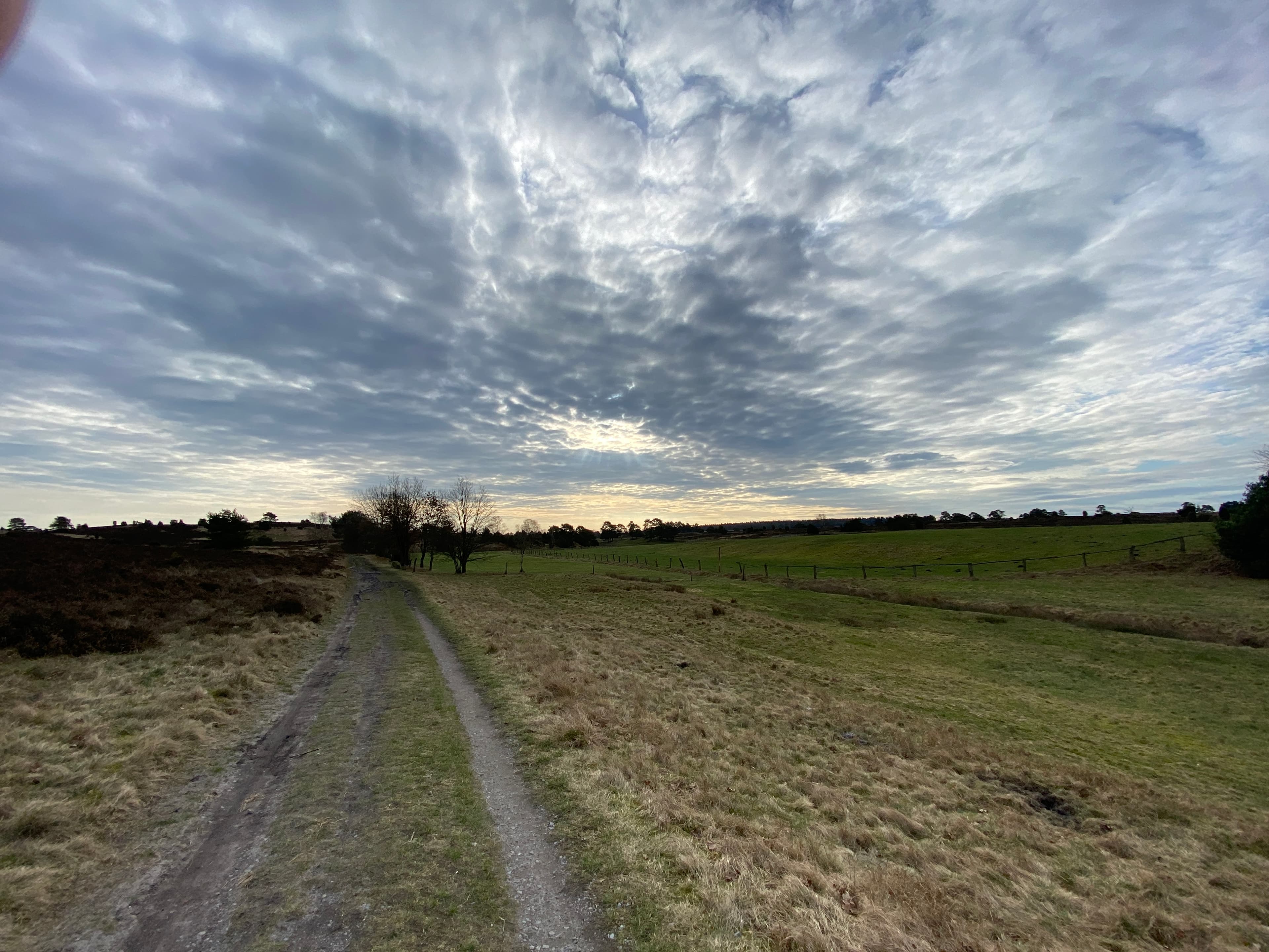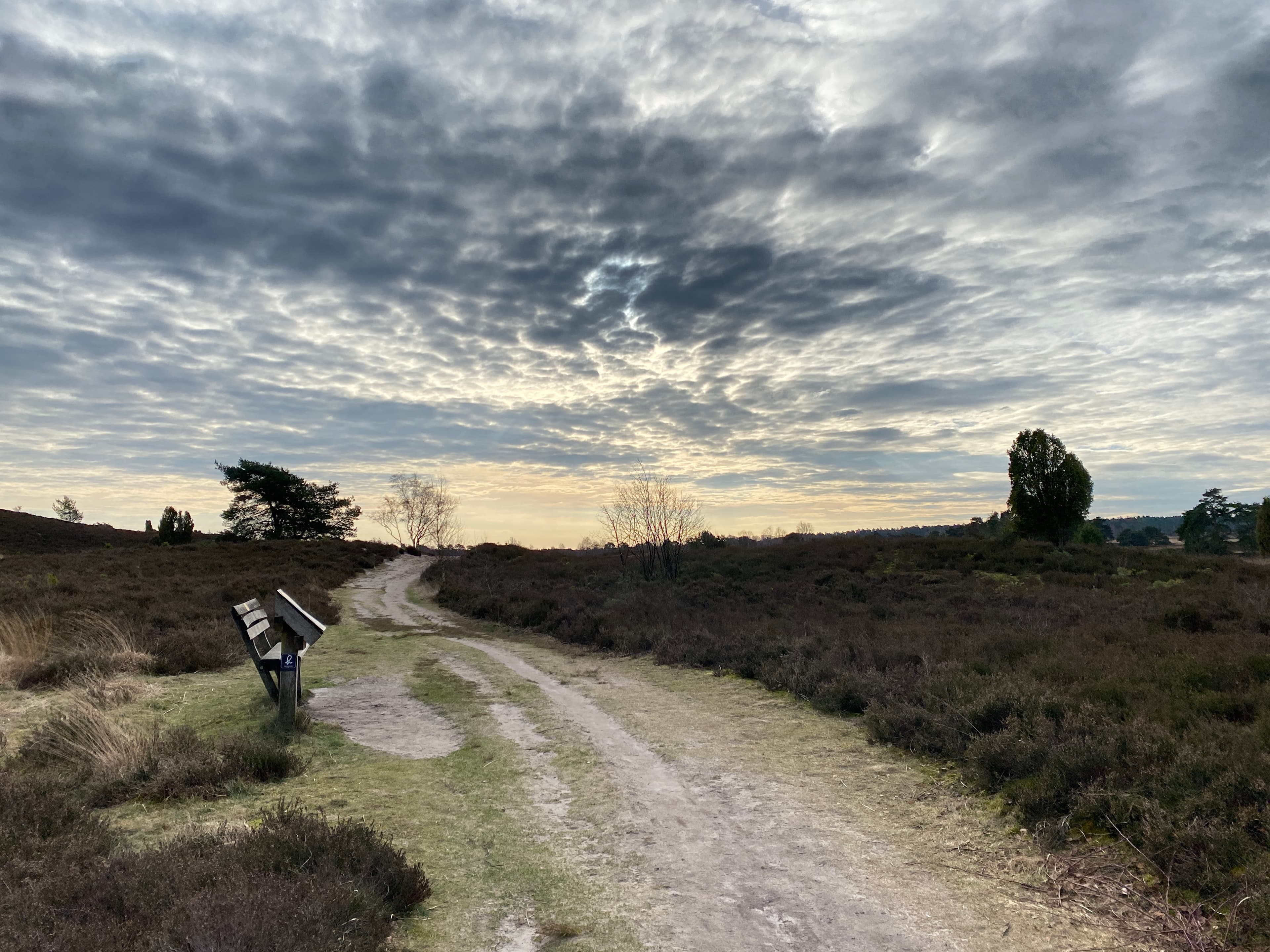 Gleich zu Beginn des Weges die erste Notiz in meinem Tourenbuch: dieser Weg macht auch jetzt früh im Jahr Spaß. Eindrucksvolle Ausblicke in eine weitläufige Landschaft, strahlender Sonnenschein, eine beeindruckende Wolkenbildung. Karte und Wander-App brauche ich momentan nicht, denn die Heideschleifen-Markierungen sind wirklich sehr gut sichtbar an Bänken und Holzpfosten angebracht und geben die Richtung eindeutig vor.