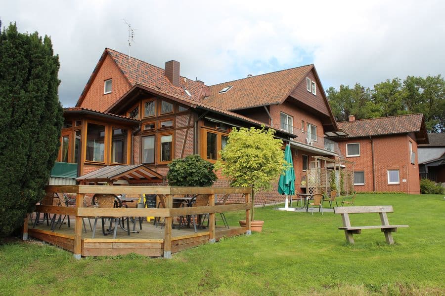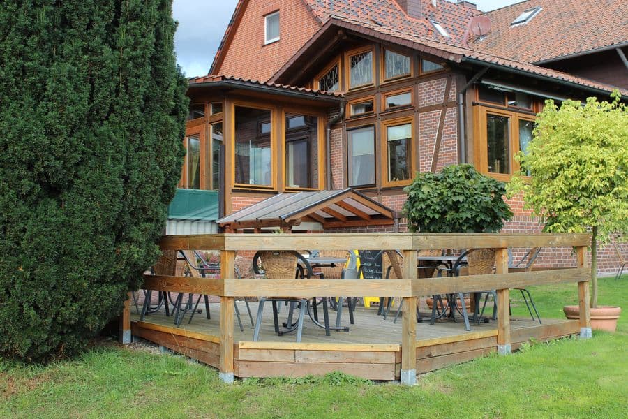 Die Sonnenterrasse und der Garten laden zum Verweilen ein. Wir bieten Ihnen auch Gartenliegen und -Stühle zum Entspannen und zum Lesen von Zeitschriften oder Büchern in einer ruhigen Ecke des Gartens, direkt am Weesener Bach.