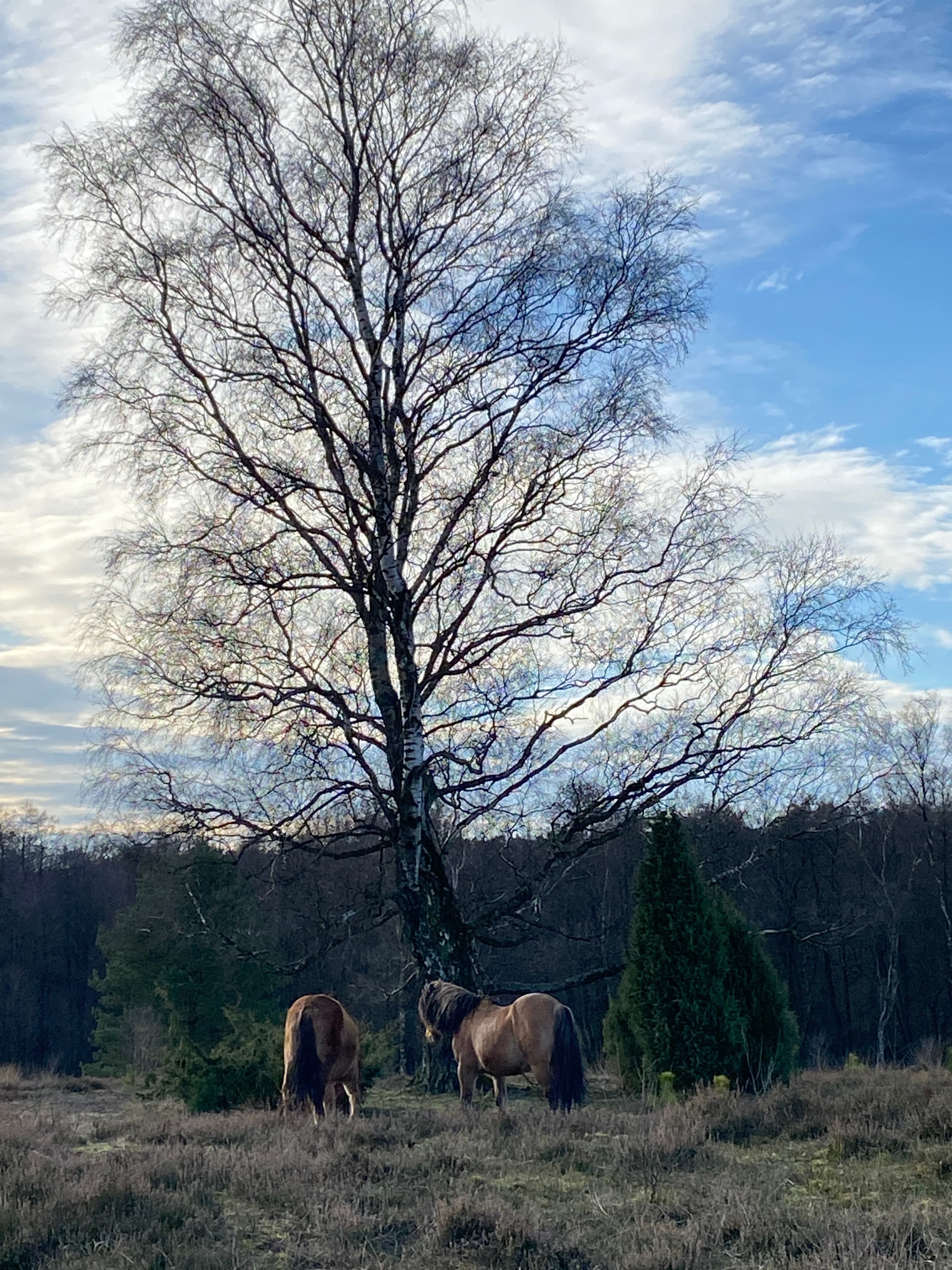 Mein Blick geht in die Weite des Talgrundes zu meiner Rechten. Aber warum in die Ferne schauen? Direkt neben mir entdecke ich zwei Vierbeiner, die in aller Ruhe frühstücken. Ich habe wirklich nicht damit gerechnet Dülmener Pferden zu begegnen und freue mich um so mehr. Die Beiden gehen langsam auf Distanz, lassen sich aber nicht bei der Nahrungsaufnahme stören. Wirklich ein sehr schönes Erlebnis und ich stelle mir die Tiere in einer blühenden Heidelandschaft vor…Ganz klarer Entschluss: Hier muss ich zur Heideblüte wieder hin.