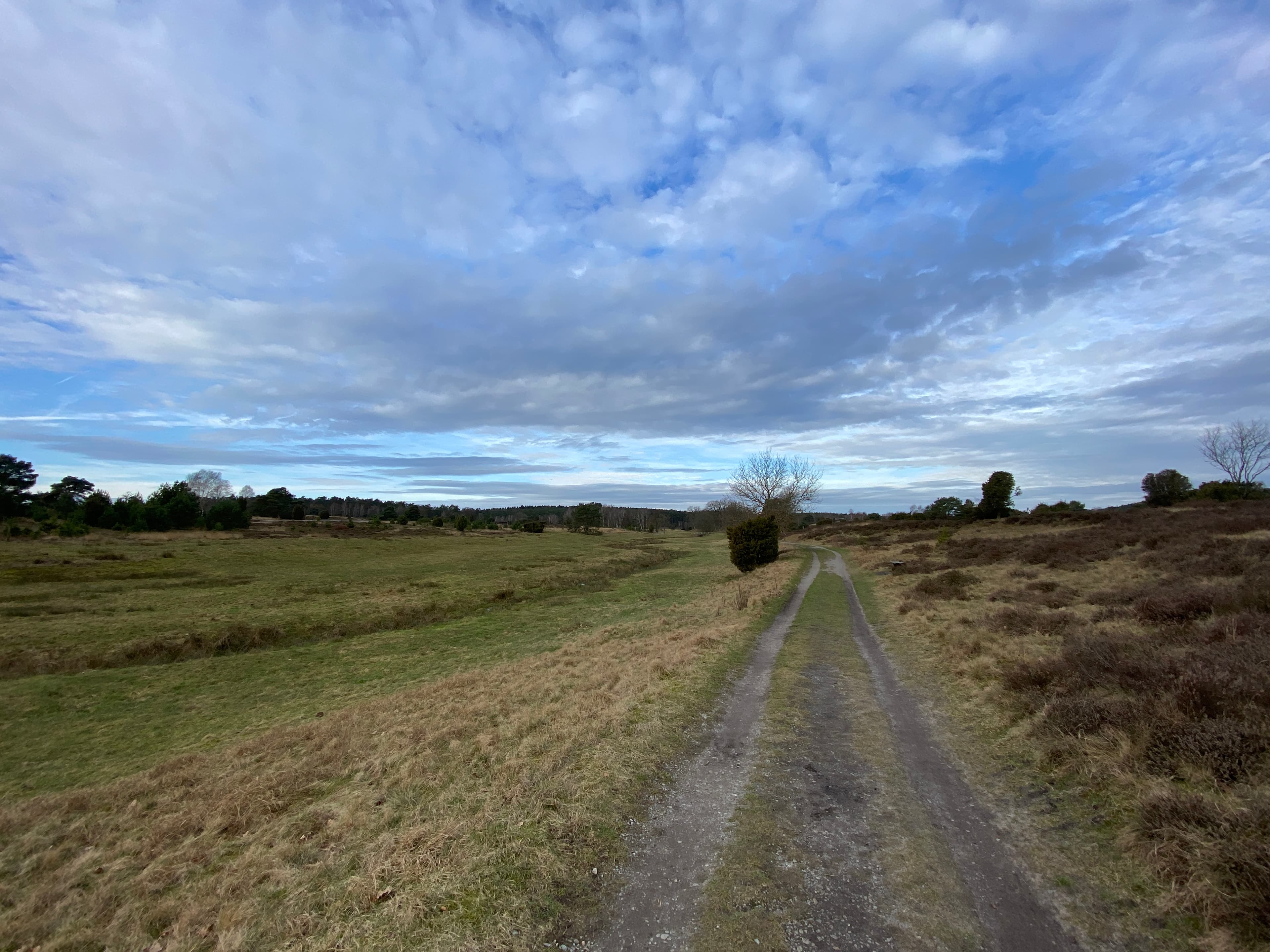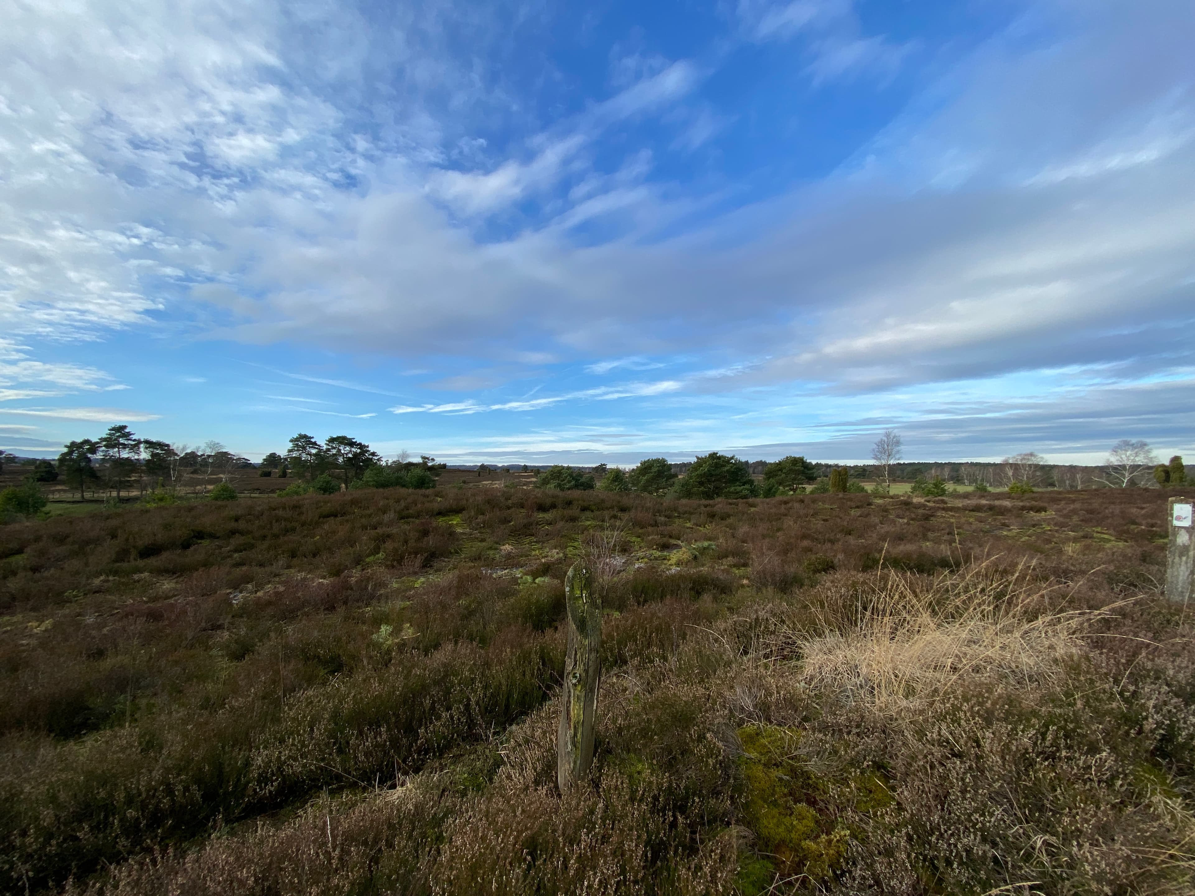 Gleich zu Beginn des Weges die erste Notiz in meinem Tourenbuch: dieser Weg macht auch jetzt früh im Jahr Spaß. Eindrucksvolle Ausblicke in eine weitläufige Landschaft, strahlender Sonnenschein, eine beeindruckende Wolkenbildung. Karte und Wander-App brauche ich momentan nicht, denn die Heideschleifen-Markierungen sind wirklich sehr gut sichtbar an Bänken und Holzpfosten angebracht und geben die Richtung eindeutig vor.