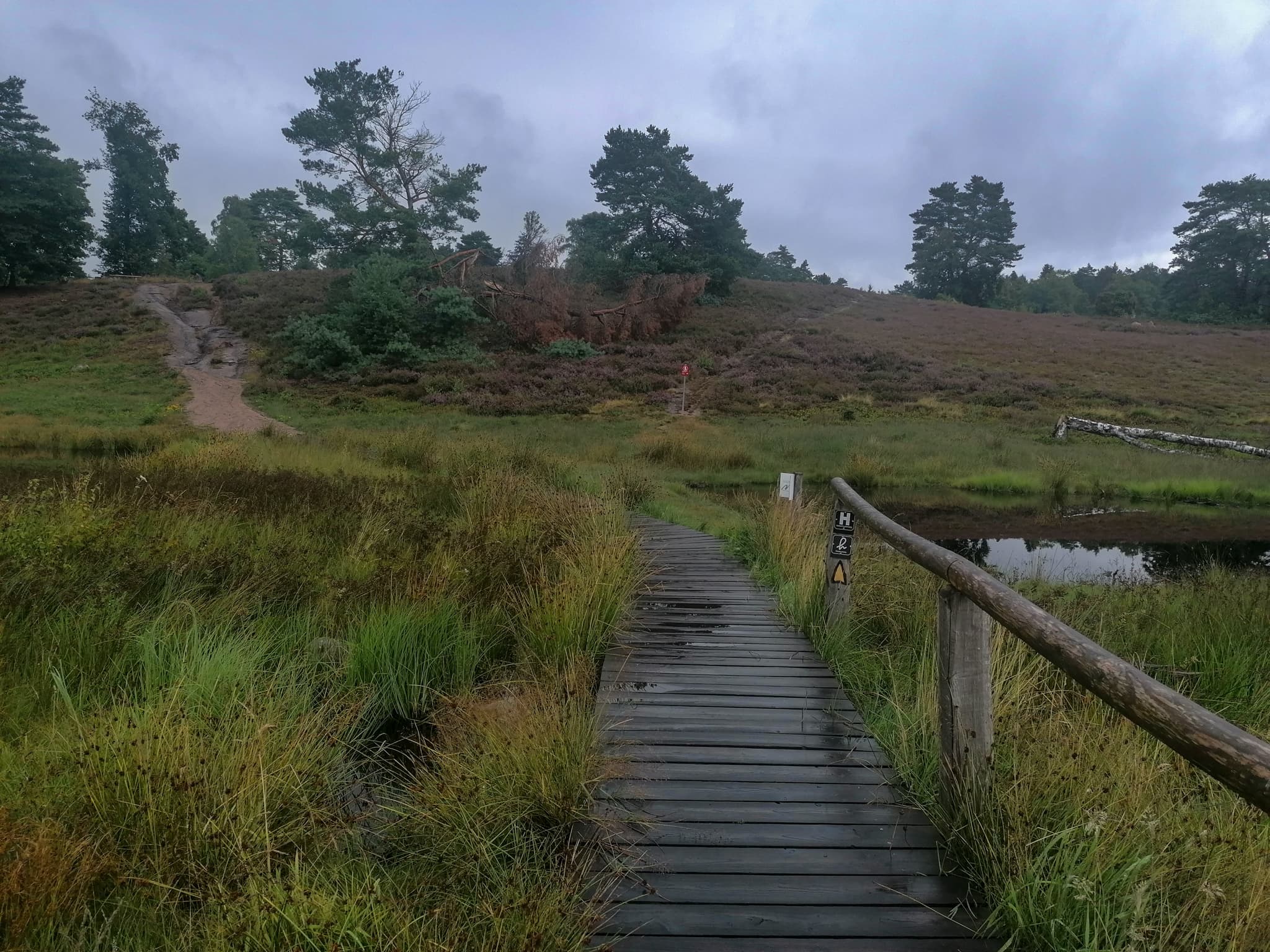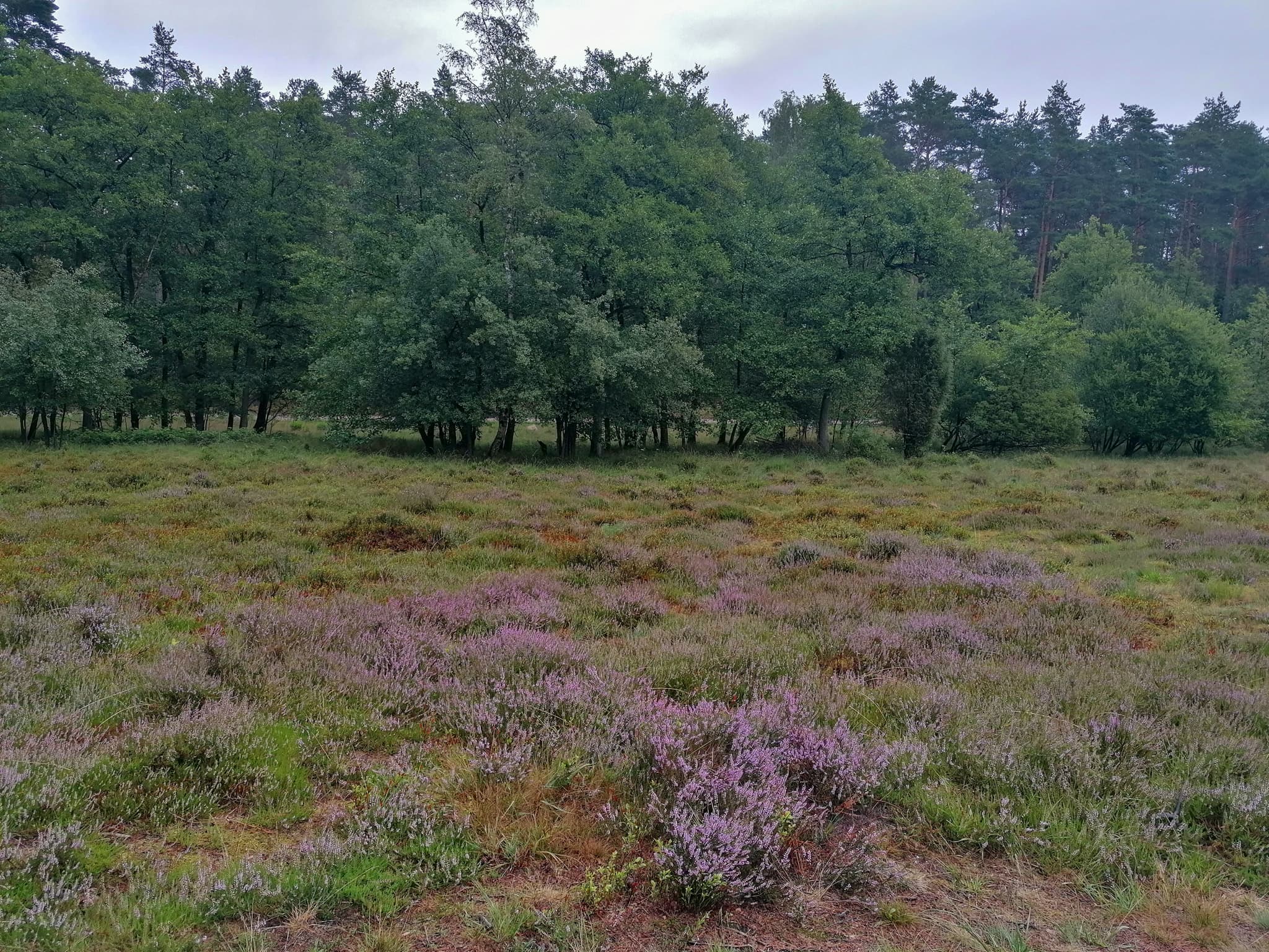 Hinaus aus dem Wald erblicken wir ein weites, lila Blütenmeer. Dieser beeindruckende Anblick verstärkt sich als wir die Spitze des Brunsbergs erreichen. Trotz des anhaltenden Nieselregens leuchten die Heidepflanzen in den schönsten Lilatönen. Diese lassen sich aufgrund des Regens leider nicht auf unseren Fotos festhalten.