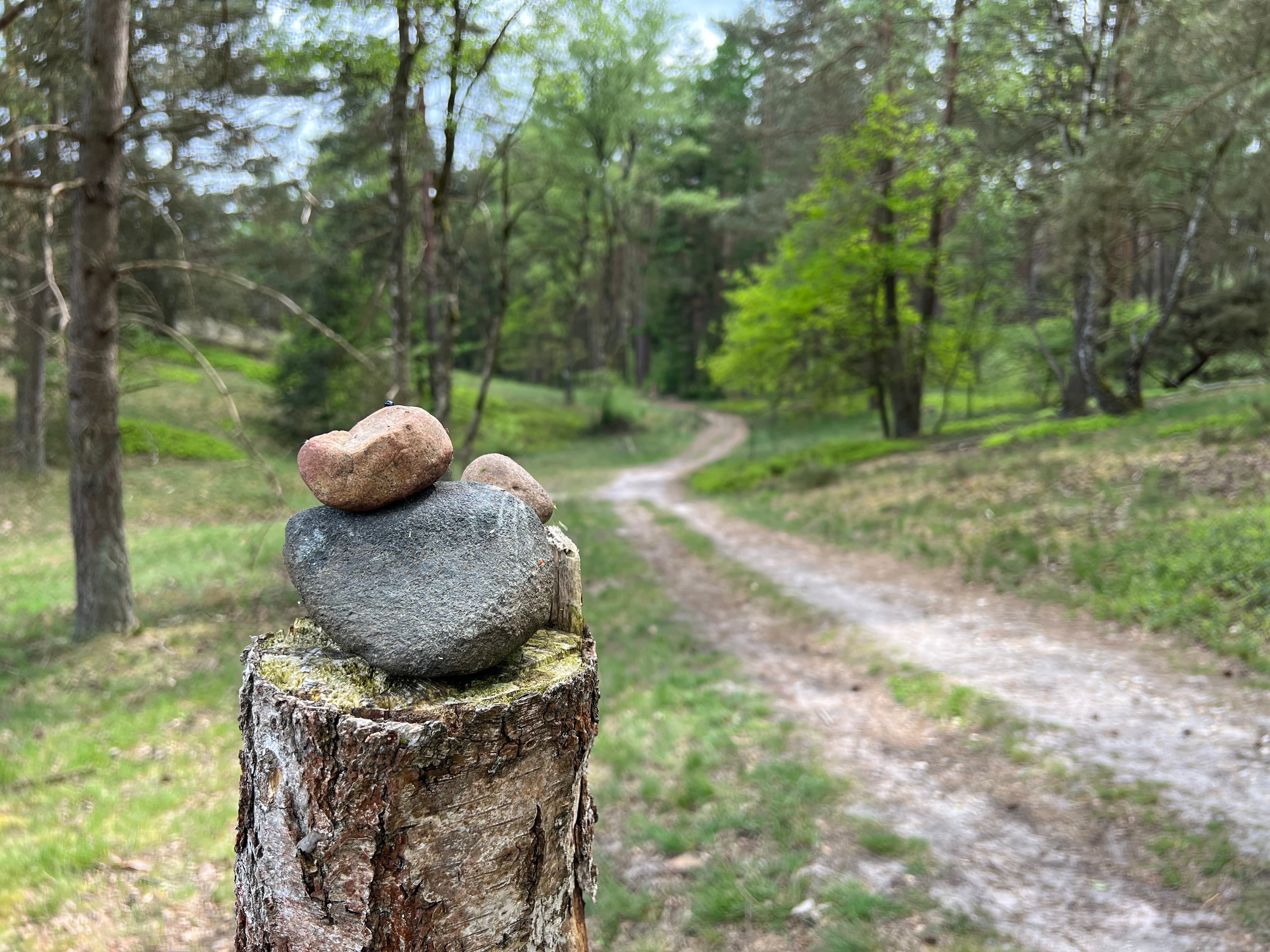 Wann immer mir mein Wanderrucksack lästig wird, muss ich an die Szene in dem Film „Der große Trip - Wild“ denken, in der Reese Witherspoon angehalten wird, einen Großteil ihrer überflüssigen Habseligkeiten auszusortieren, um die Wildnis am Pazifik leichter zu bewältigen. Nun ist ein Gang durch die Heide kein lebensgefährliches Unterfangen. Und doch ist es auch hier wie im echten Leben: Letztlich sind es Prioritäten, die beim Wandern sinnvoll gesetzt werden wollen. So in der Art verstehe ich auch die Botschaften, die meine Vorgänger auf Steine gemalt haben. Der digitale Navigator, das illustre Magazin und die Kopfhörer im Ohr – all das lenkt ab vom unmittelbaren (Er-)-Leben im Hier und Jetzt.