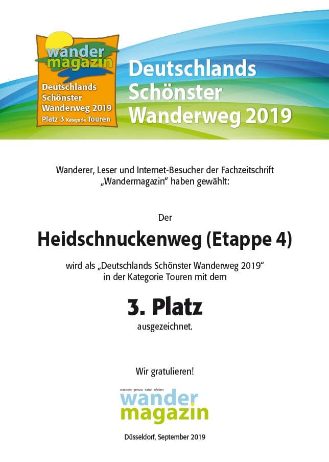 Der Heidschnuckenweg (Etappe 4) wird als "Deutschlands Schönster Wwanderweg 2019" in der Kategorie Touren mit dem 3. Platz ausgezeichnet!
