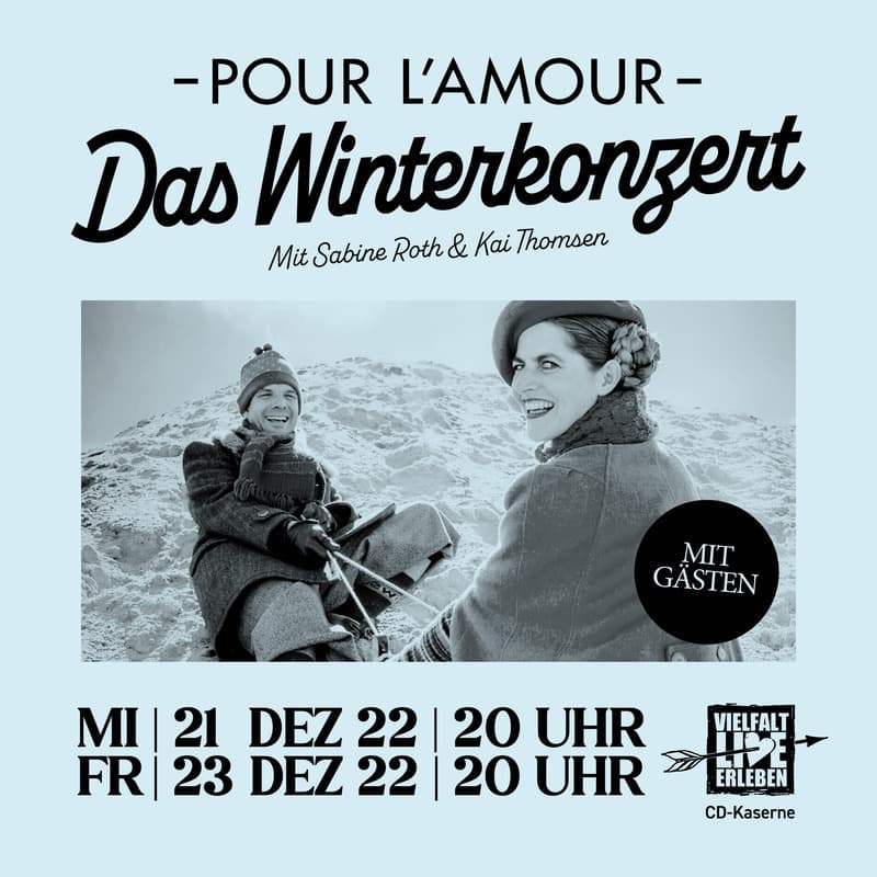 Pour LAmour sind Sabine Roth (Gesang) und Kai Thomsen (Gitarre). Ein Chanson-Duo, das seit über 20 Jahren überregional erfolgreich auf Kleinkunstbühnen auftritt. Das Duo schafft es immer wieder mit Leichtigkeit ab dem ersten Moment, sein Publikum mit unverstellter und ehrlicher Begeisterung für deutsche und französische Chansons zu begeistern. Sabine Roth erobert mit ihrer facettenreichen Stimme und hinreißender Darbietung die Herzen des Publikums. Kai Thomsen, virtuos, leidenschaftlich und sensibel auf der Gitarre, ist der tragende Gegenpart. Die Stärken des Duos liegen nicht nur bei einem humorvollen Miteinander auf der Bühne, sondern auch bei einem liebevollen und augenzwinkernden Einbeziehen des Publikums. Das Winterkonzert dreht sich an diesem Abend rund um die kalte Jahreszeit und Weihnachten. Mit französischen, englischen und deutschen Weihnachts- und Winterliedern, sowie einigen ganz neu erarbeiteten Stücken wird dies ein stimmungsvoller, heiterer und besinnlicher Abend. Ein herzerwärmender Abend zum Innehalten und für Momente der Freude und Dankbarkeit.