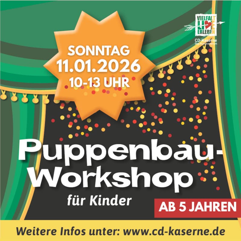 Am Samstag, den 11. Januar 2026 lädt die CD-Kaserne in Celle Kinder ab 5 Jahren zu einem ganz besonderen kreativen Erlebnis ein: Ein Puppenbau-Workshop, bei dem junge Teilnehmer*innen ihre eigene Puppe gestalten und anschließend in einem kleinen Theaterstück zum Leben erwecken können. Der Workshop bietet eine einzigartige Gelegenheit, Kreativität und Fantasie zu fördern und dabei die Welt des Theaters spielerisch kennenzulernen.