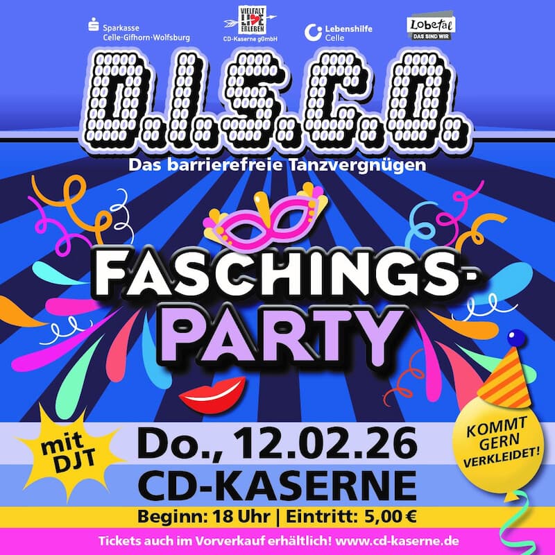 Die Veranstaltung ist eine Kooperation der CD-Kaserne gGmbH, Lebenshilfe Celle und Lobetalarbeit e.V. und findet vier- bis fünfmal jährlich statt. Die D.I.S.C.O. steht für echte Teilhabe, gelebte Inklusion und jede Menge gute Laune – eine Feier, bei der wirklich alle willkommen sind.