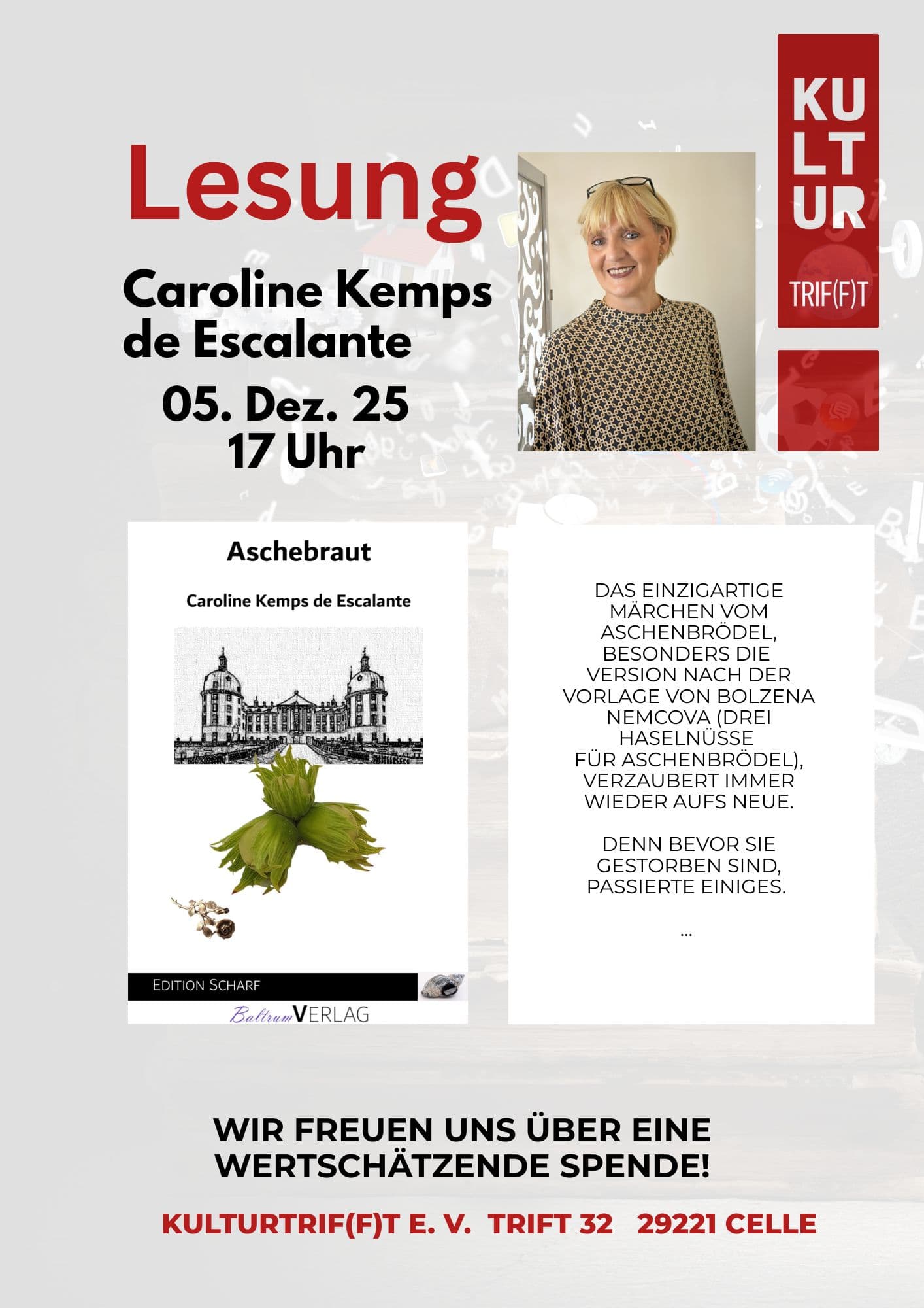 CelleAb demDas einzigartige Märchen vom Aschenbrödel verzaubert immer wieder aufs Neue. Lesung mit Caroline Kemps de Escalante, Autorin von "Aschebraut". Wenn Sie schon immer wissen wollten, wie es mit Aschenbrödel weitergegangen ist. Eintritt ist frei, um Spende wird gebeten.