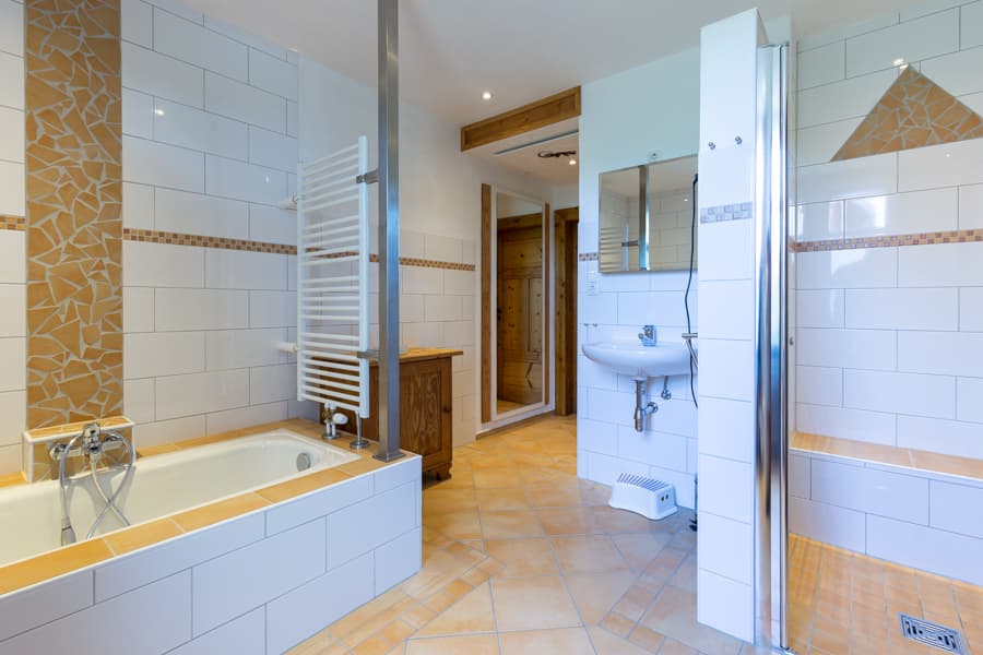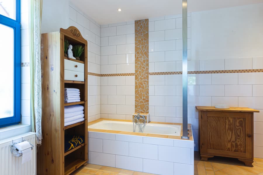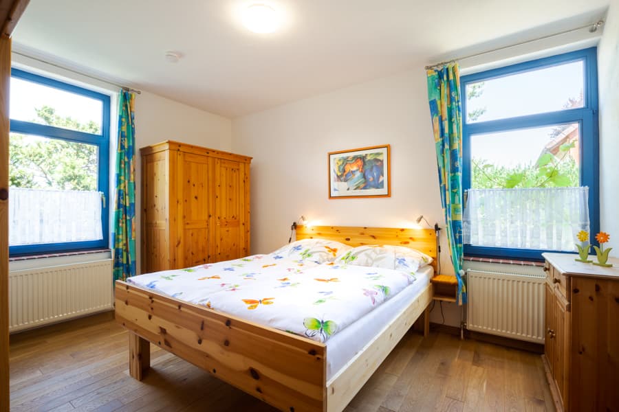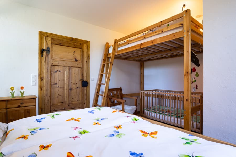 Das Schlafzimmer verfügt über ein Doppelbett (1,60 x 2 m) und ein Hochbett (1,40 x 2 m). Bei Bedarf stellen wir Ihnen gerne ein Kinderbett und einen Kinderhochstuhl zur Verfügung. Das Wohnzimmer bietet eine gemütliche Sofaecke mit Bettfunktion (1,21 x 1,90 m). Das großzügige Badezimmer ist mit einer ebenerdigen Dusche mit gemauerter Sitzbank und einer Badewanne ausgestattet und verfügt über Fußbodenheizung ebenso wie die Küche.