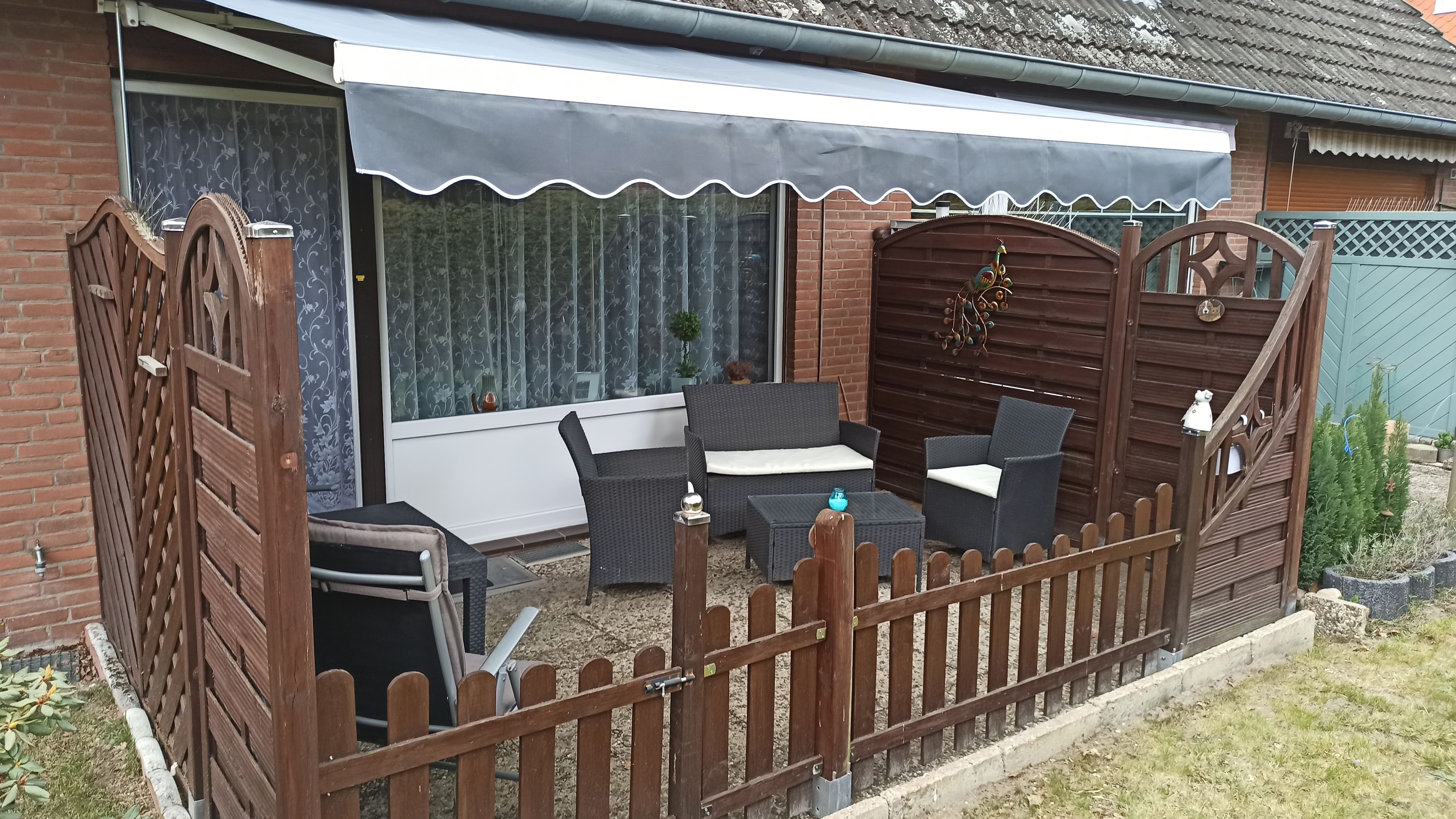 Die Terrasse mit Gartenmöbeln und Markise als Sonnenschutz kann man vom Wohnbereich aus betreten.
