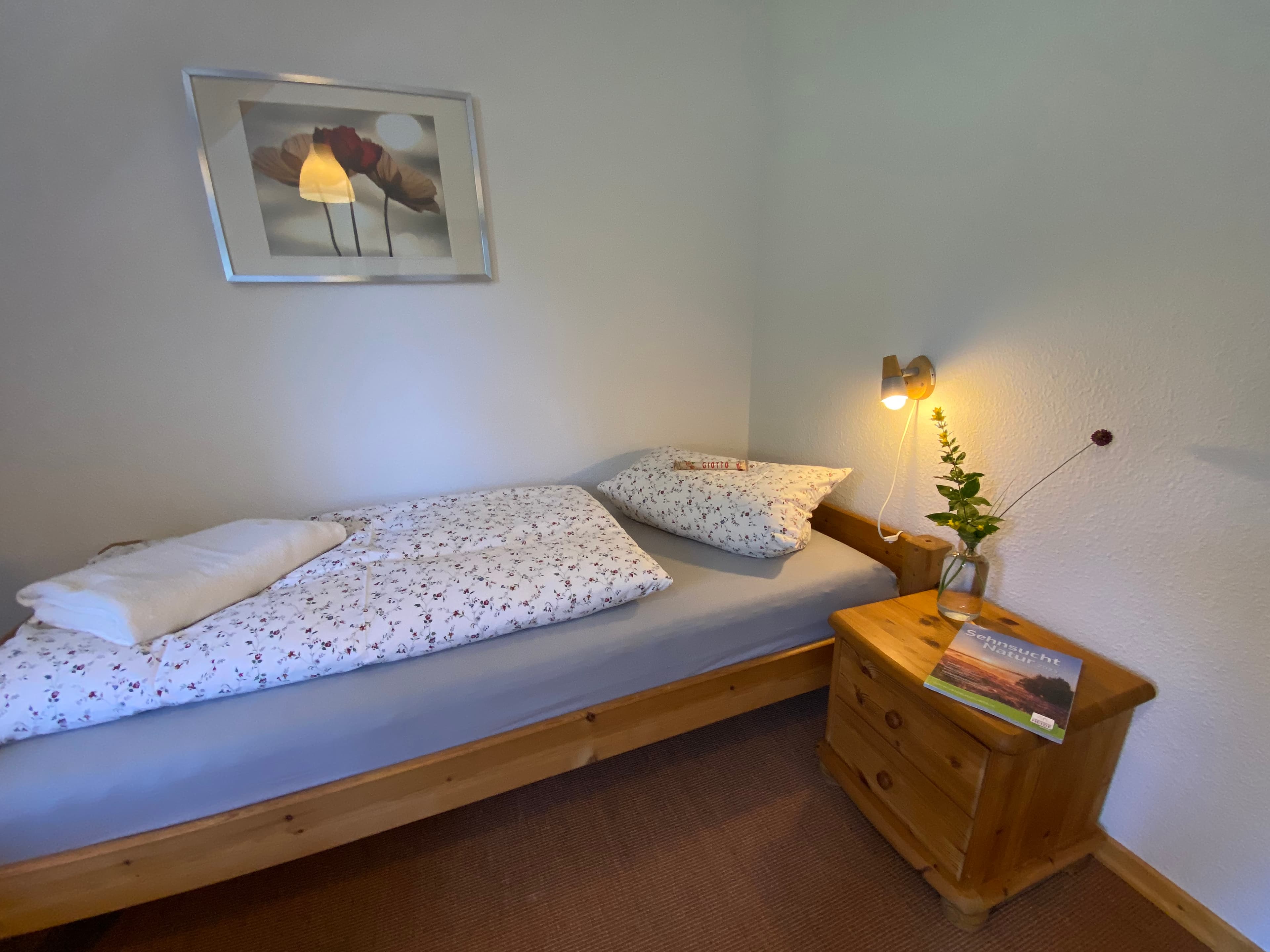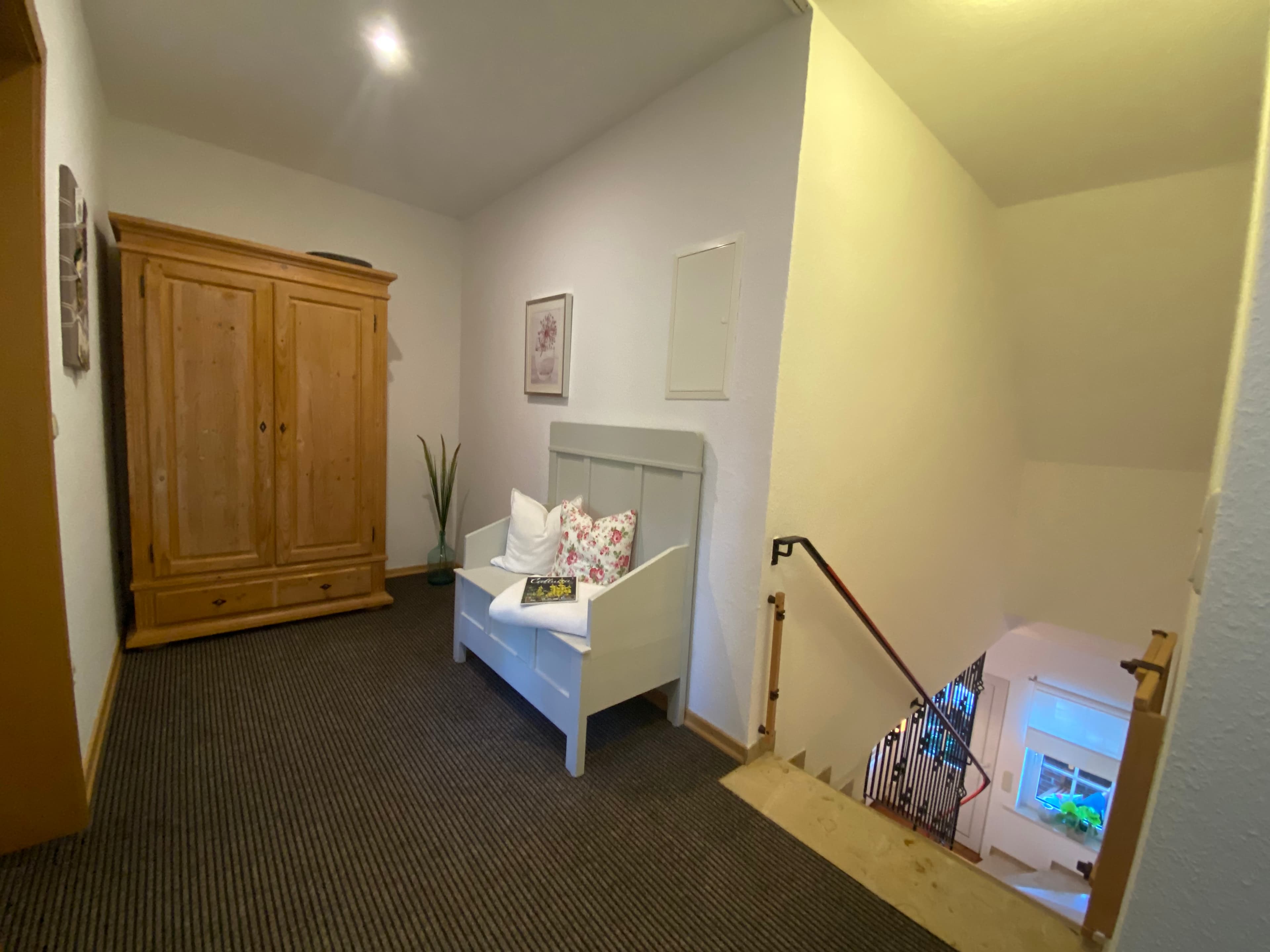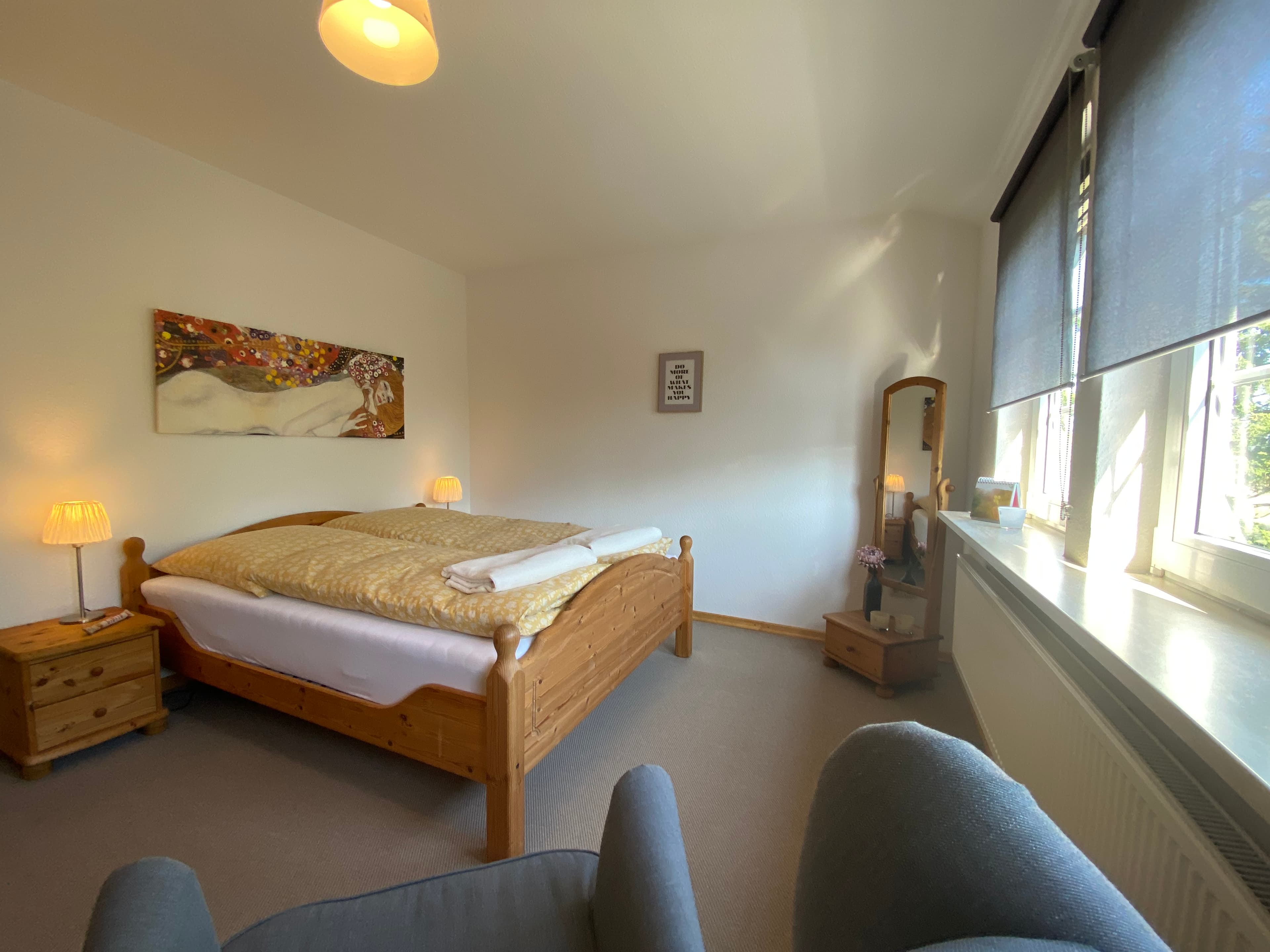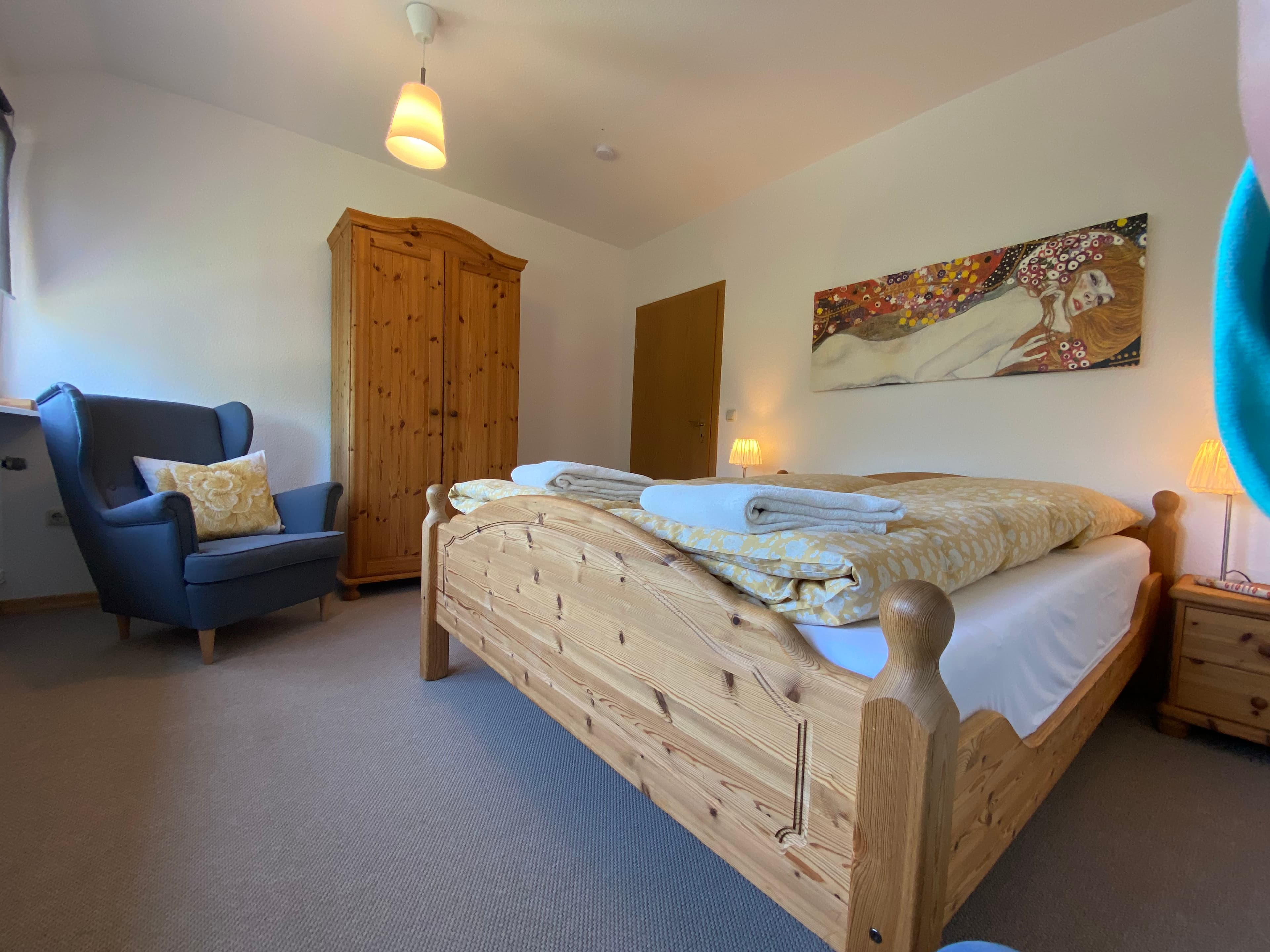 Das innenliegende großzügig geschnittene Badezimmer verfügt über Dusche und WC, Fön und Handtücher. Die Wohnung ist mit vielen schönen Holzmöbeln ausgestattet und hat eine warme Farbatmosphäre. Ein überdachter Stellplatz für Ihren PKW ist auf dem Hof.