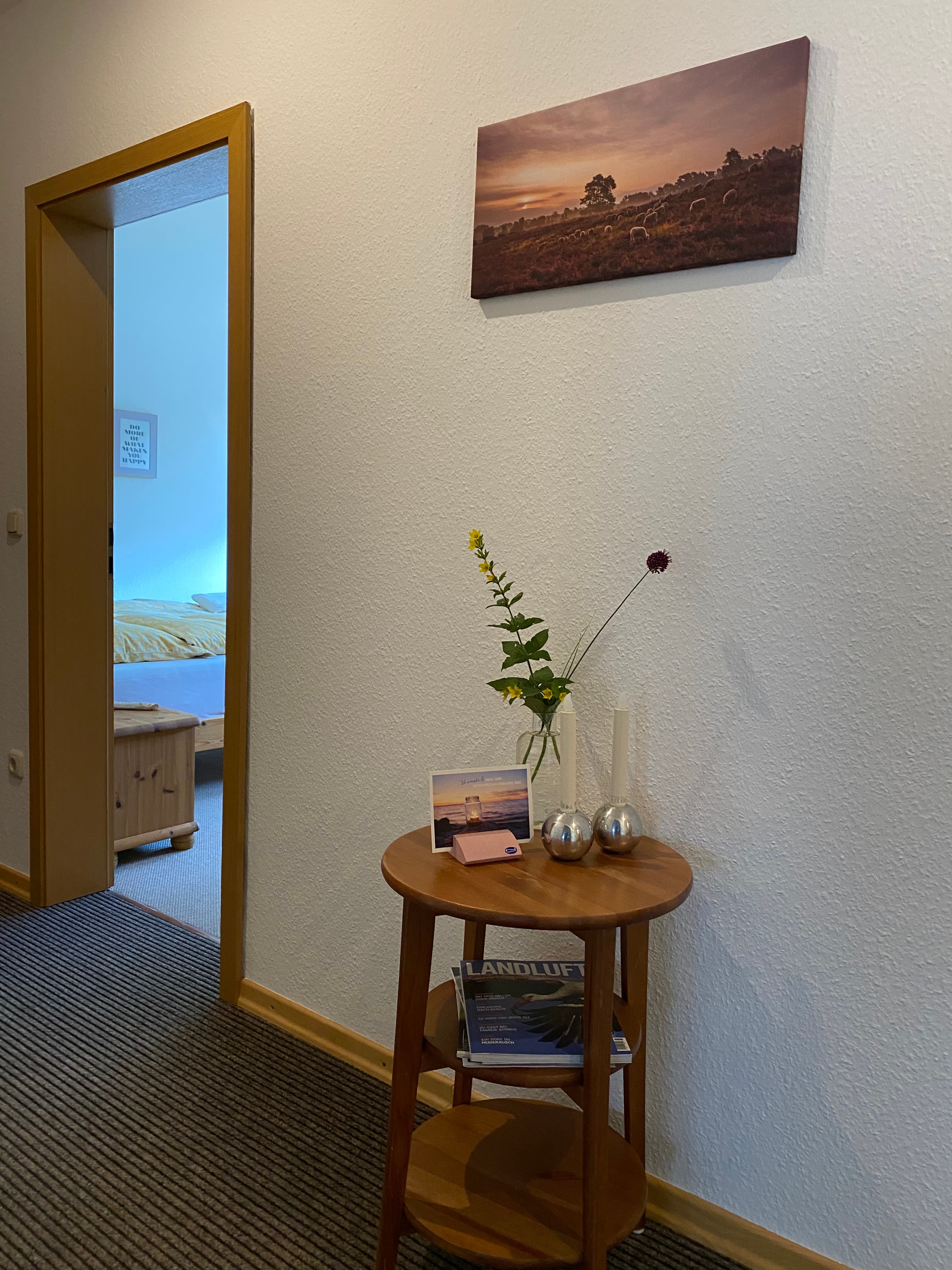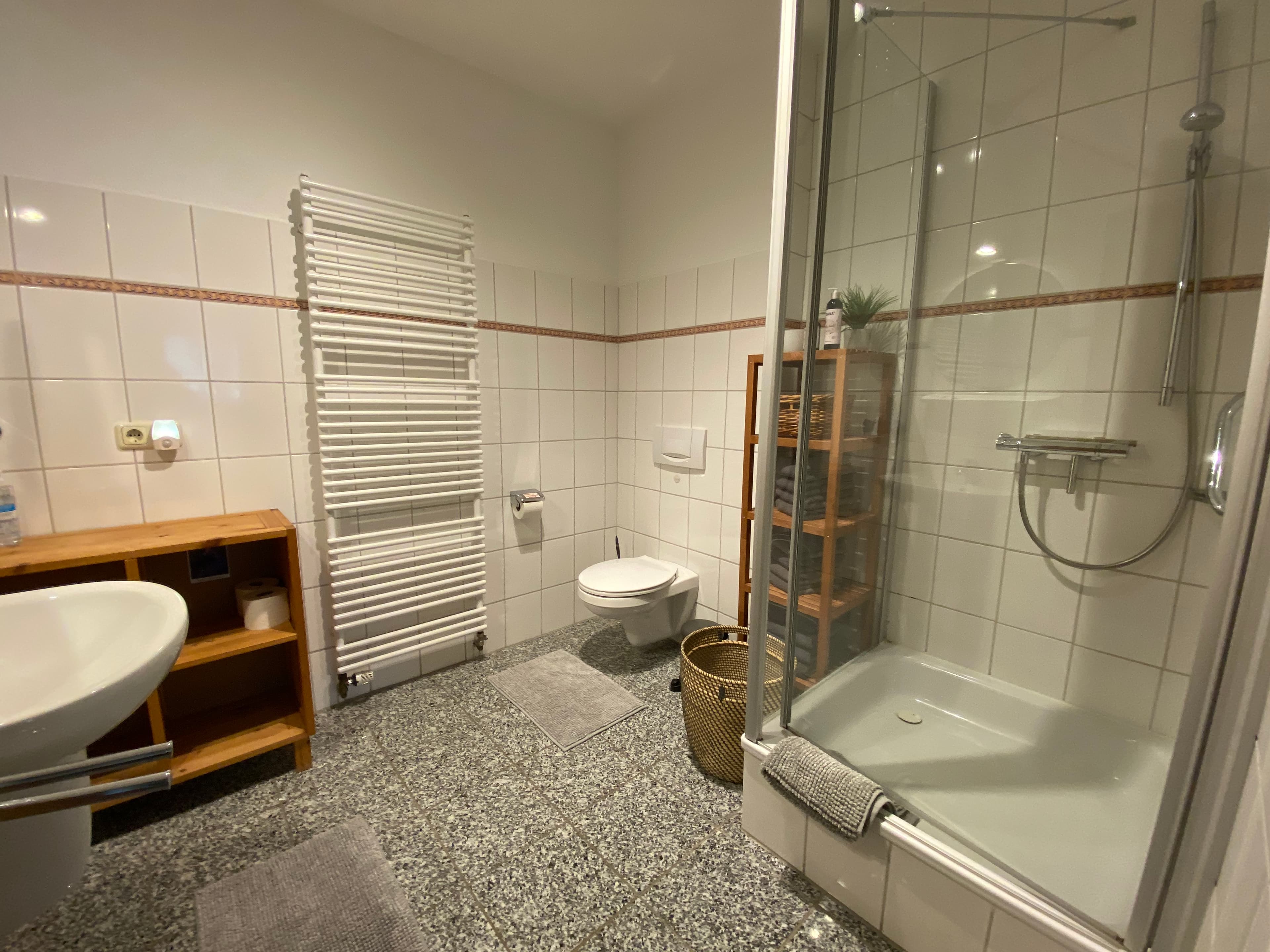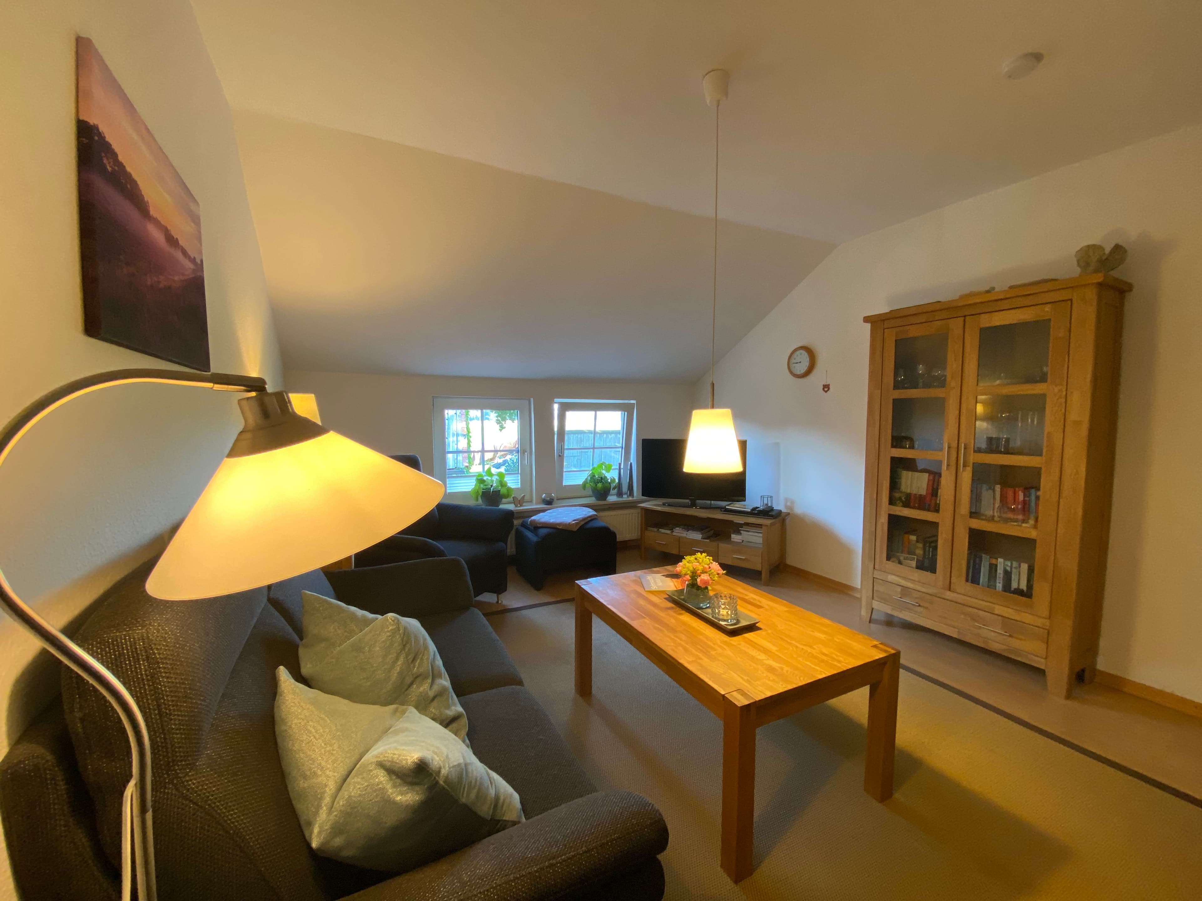 Das innenliegende großzügig geschnittene Badezimmer verfügt über Dusche und WC, Fön und Handtücher. Die Wohnung ist mit vielen schönen Holzmöbeln ausgestattet und hat eine warme Farbatmosphäre. Ein überdachter Stellplatz für Ihren PKW ist auf dem Hof.