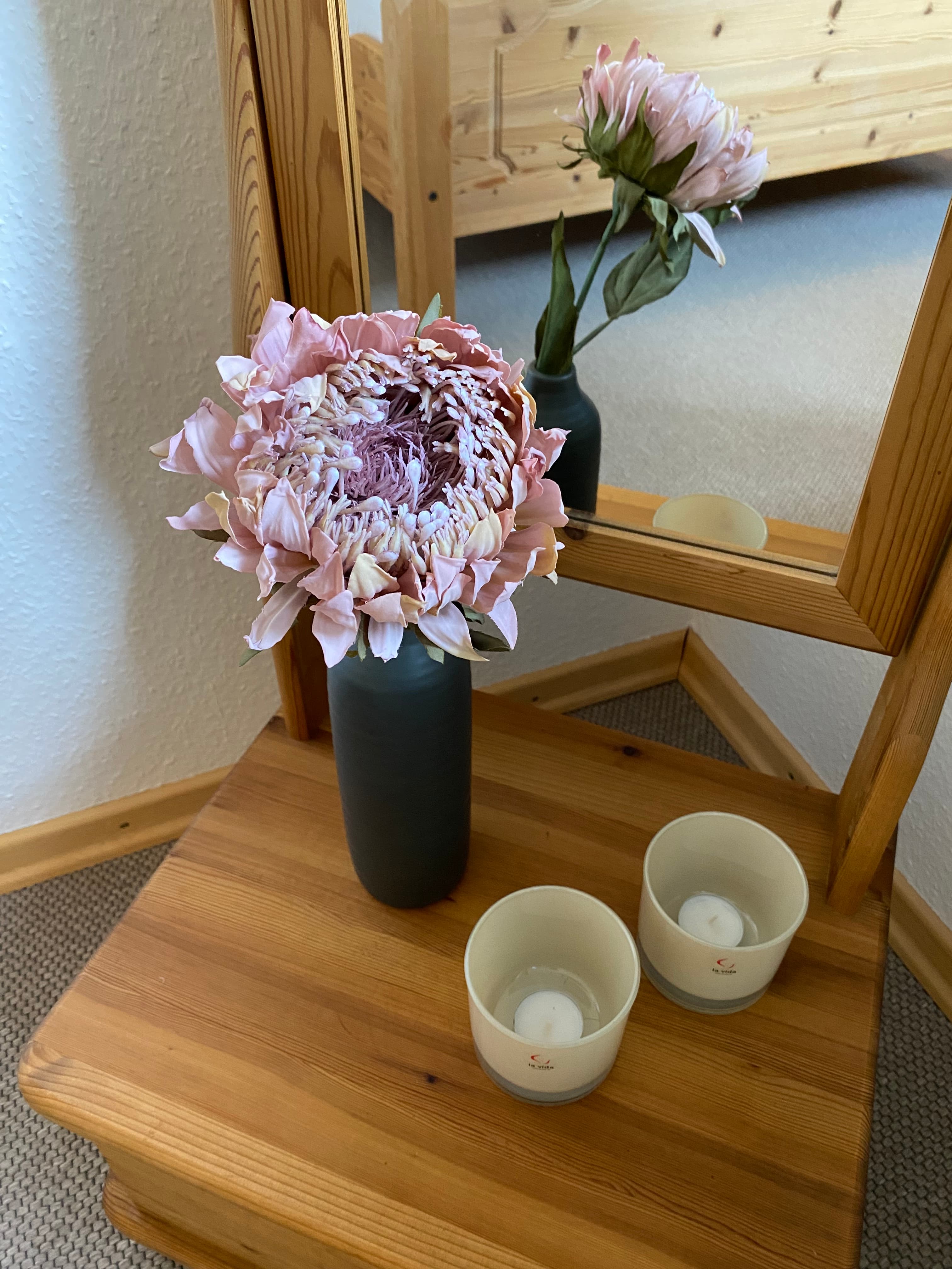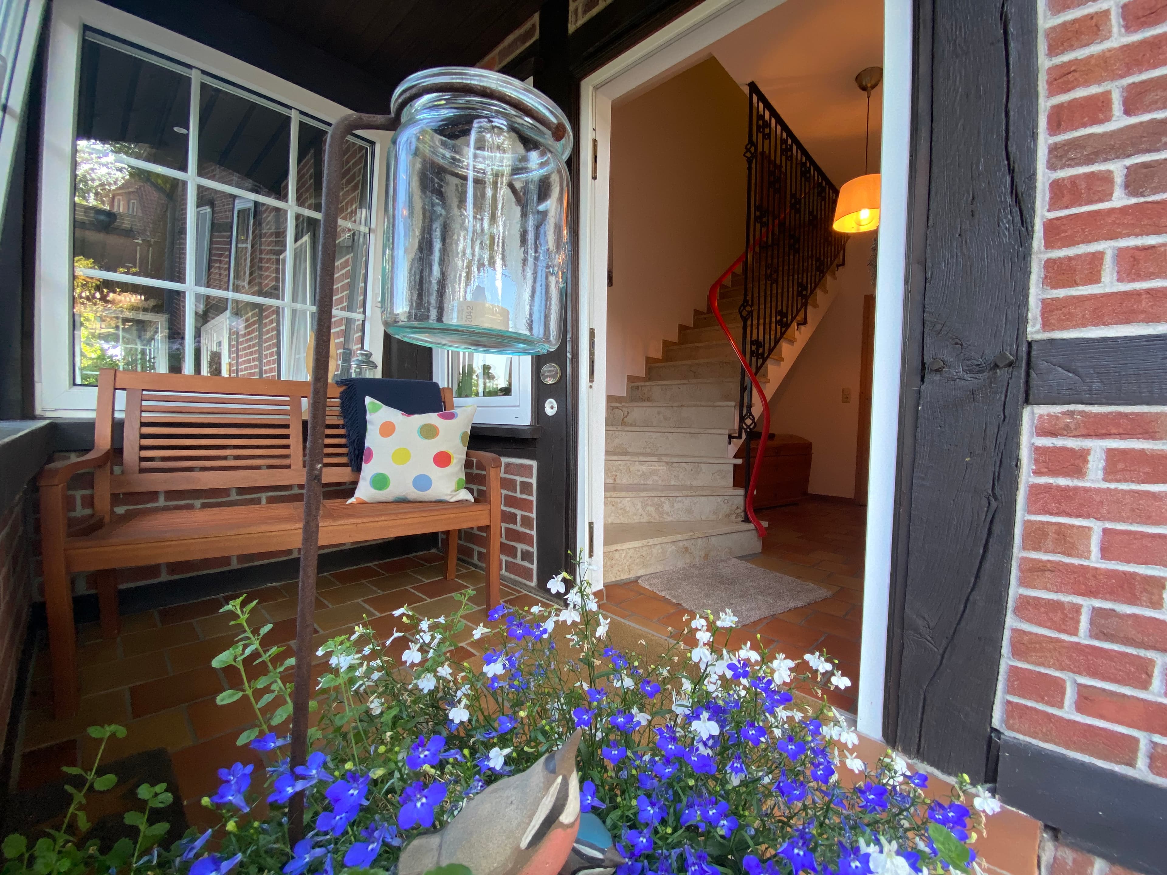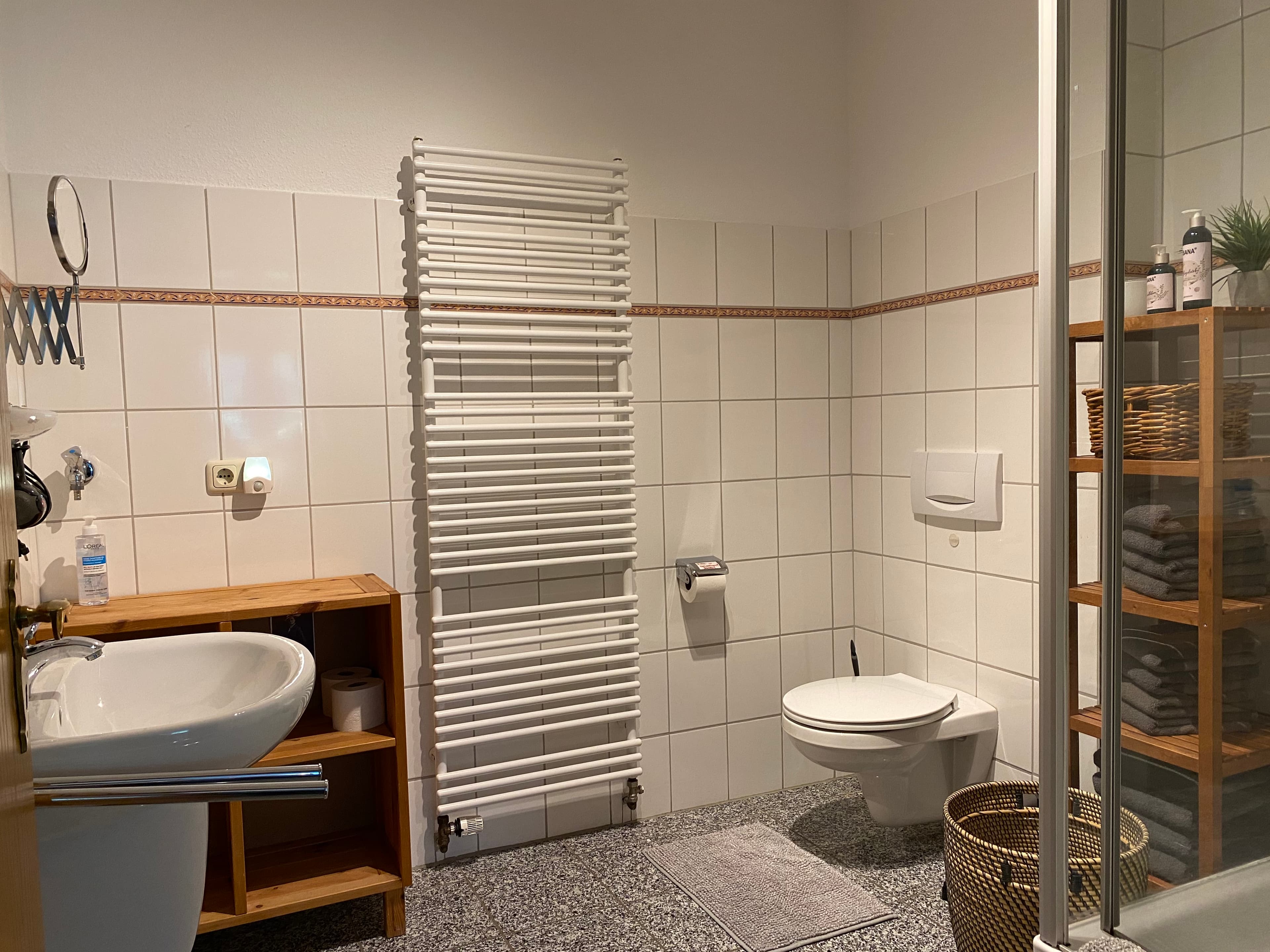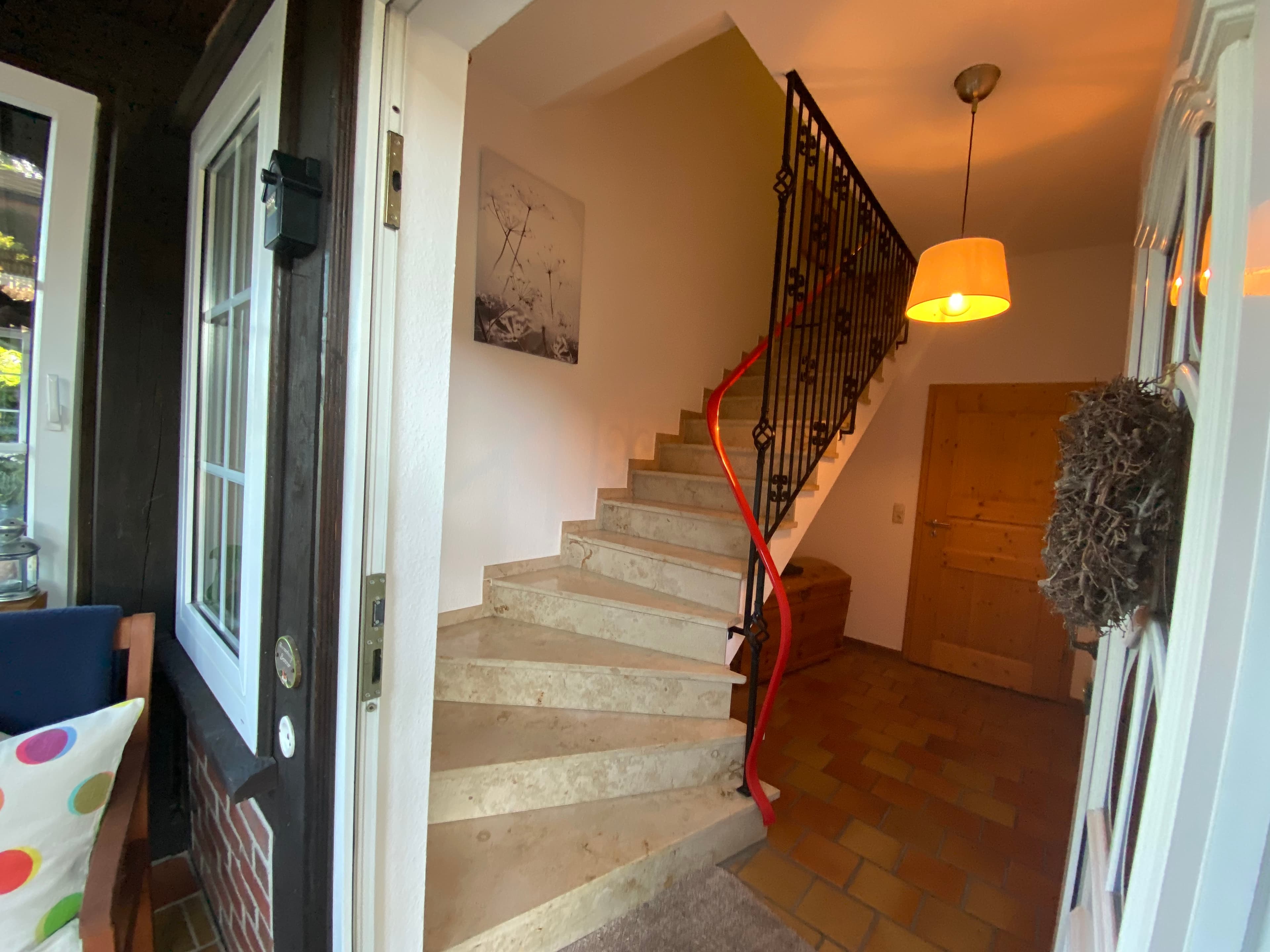 Das innenliegende großzügig geschnittene Badezimmer verfügt über Dusche und WC, Fön und Handtücher. Die Wohnung ist mit vielen schönen Holzmöbeln ausgestattet und hat eine warme Farbatmosphäre. Ein überdachter Stellplatz für Ihren PKW ist auf dem Hof.