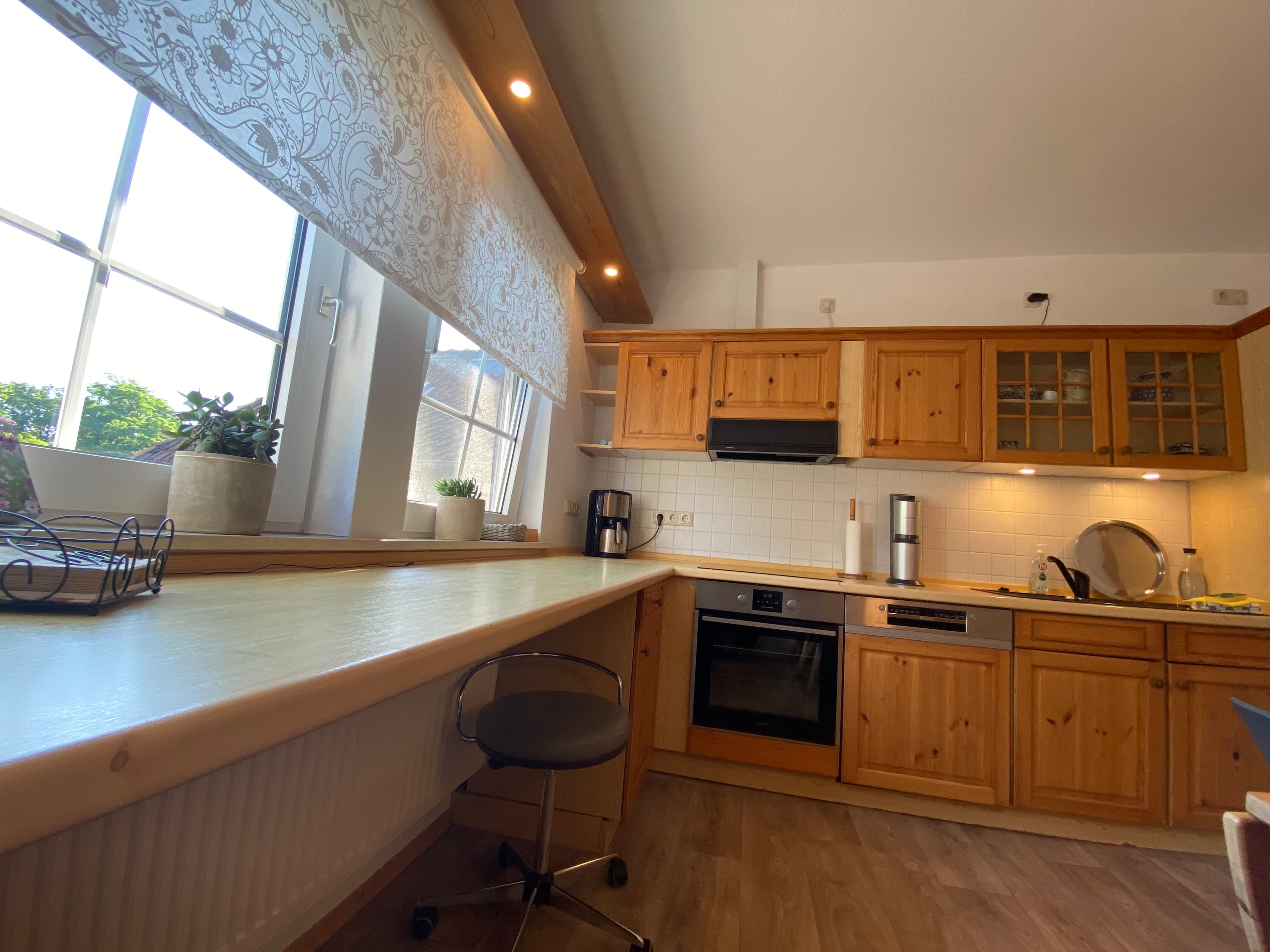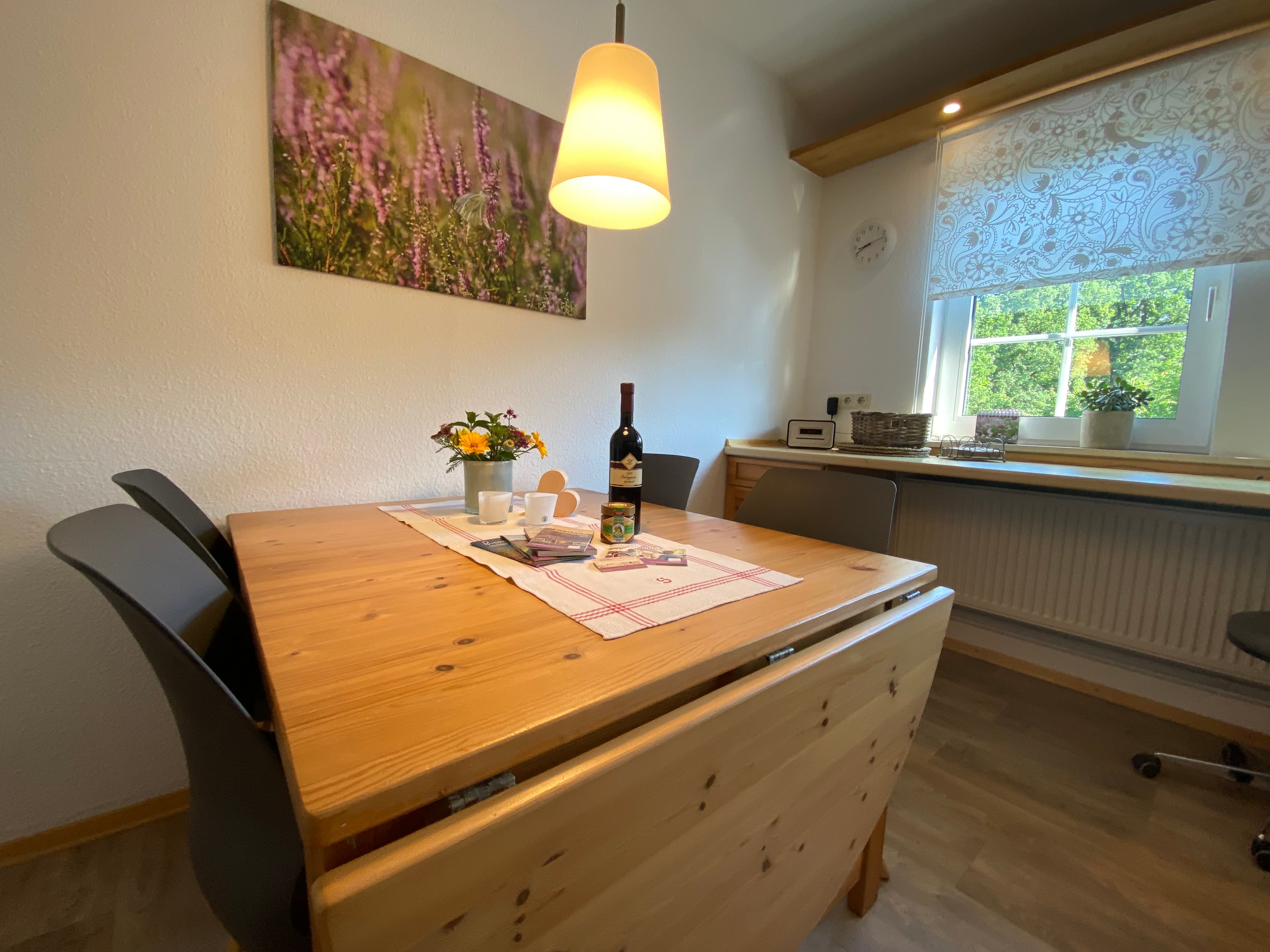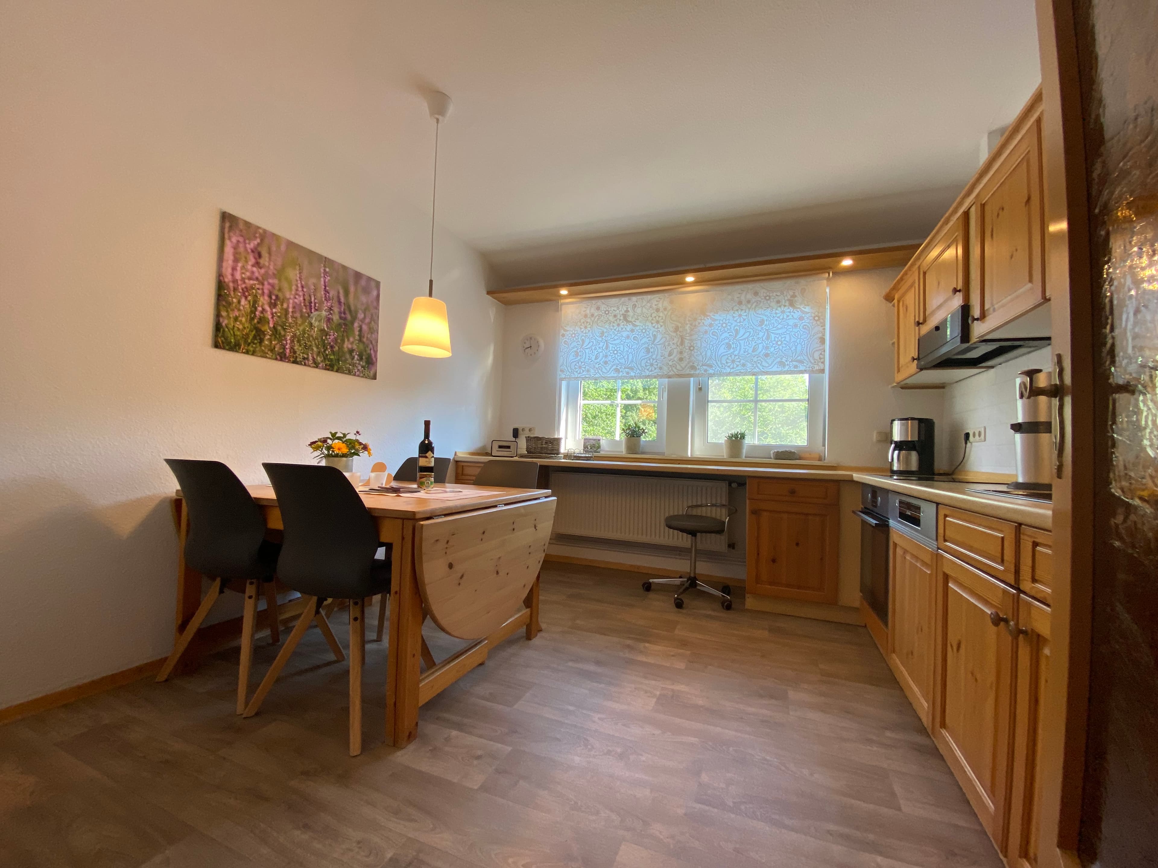 Genießen Sie den schönen Ausblick auf den Bauerngarten, die Felder und den Wald. Die große Küche ist voll ausgestattet mit Geschirrspüler, Mikrowelle, Mixer etc.
