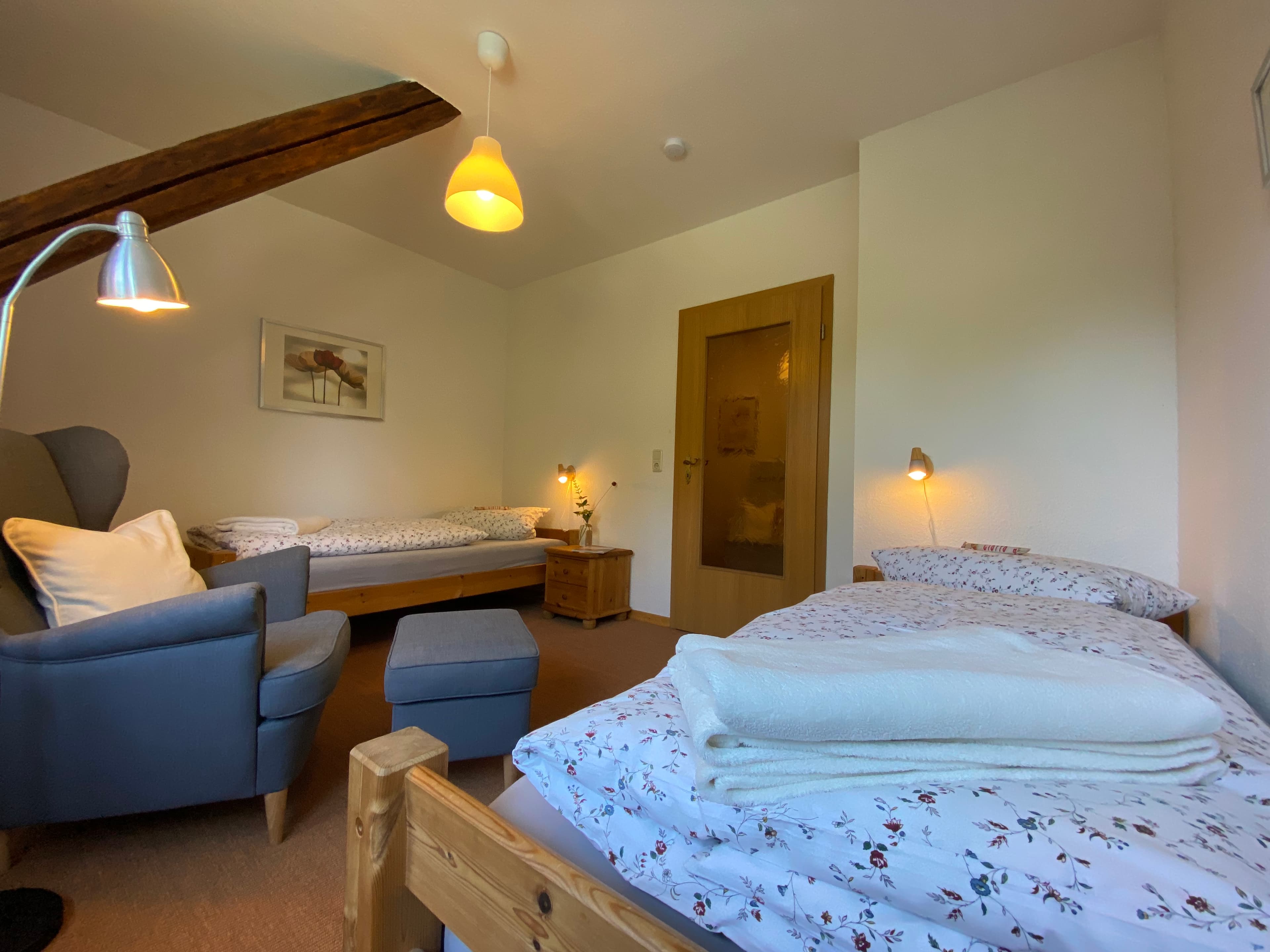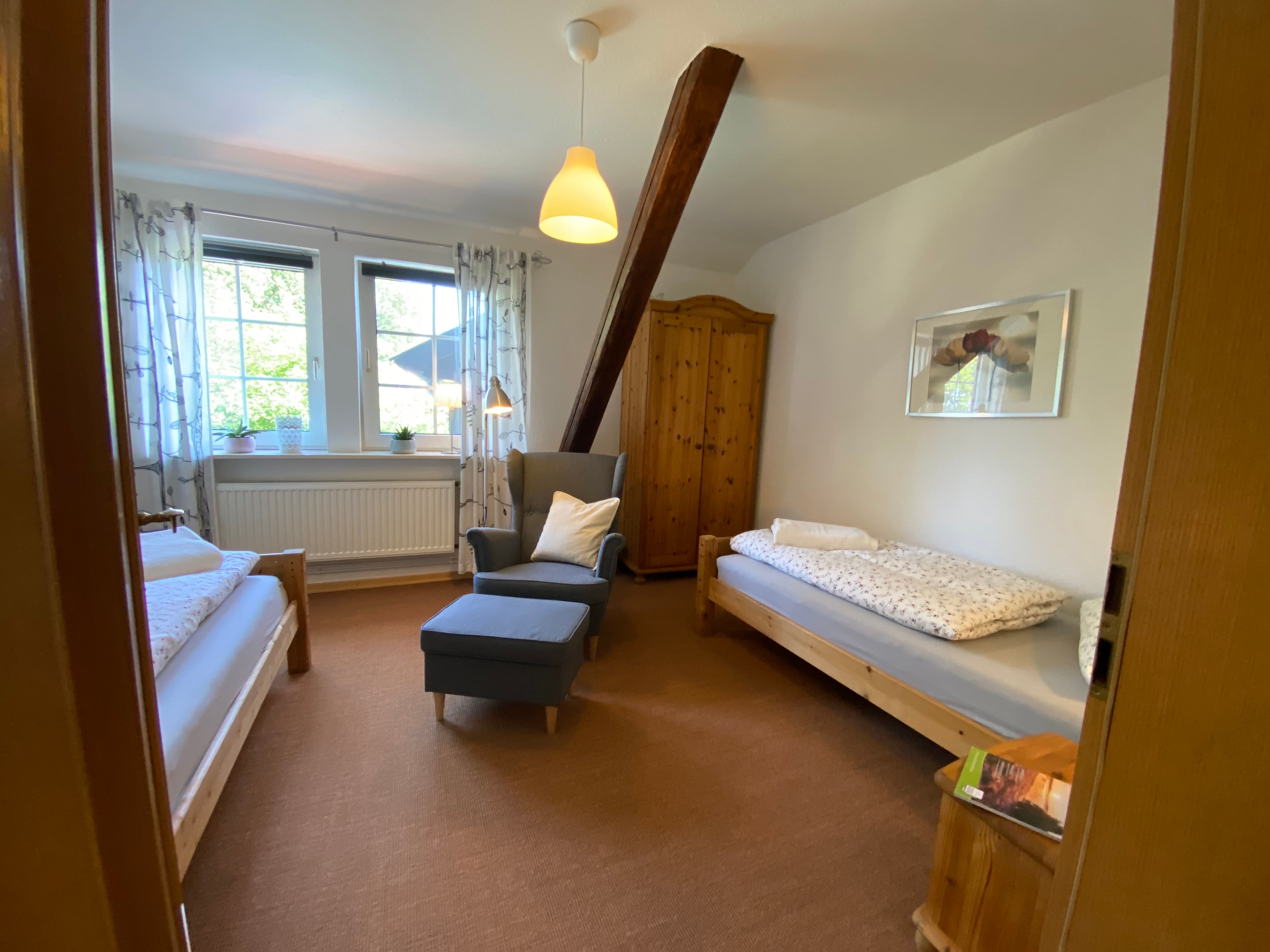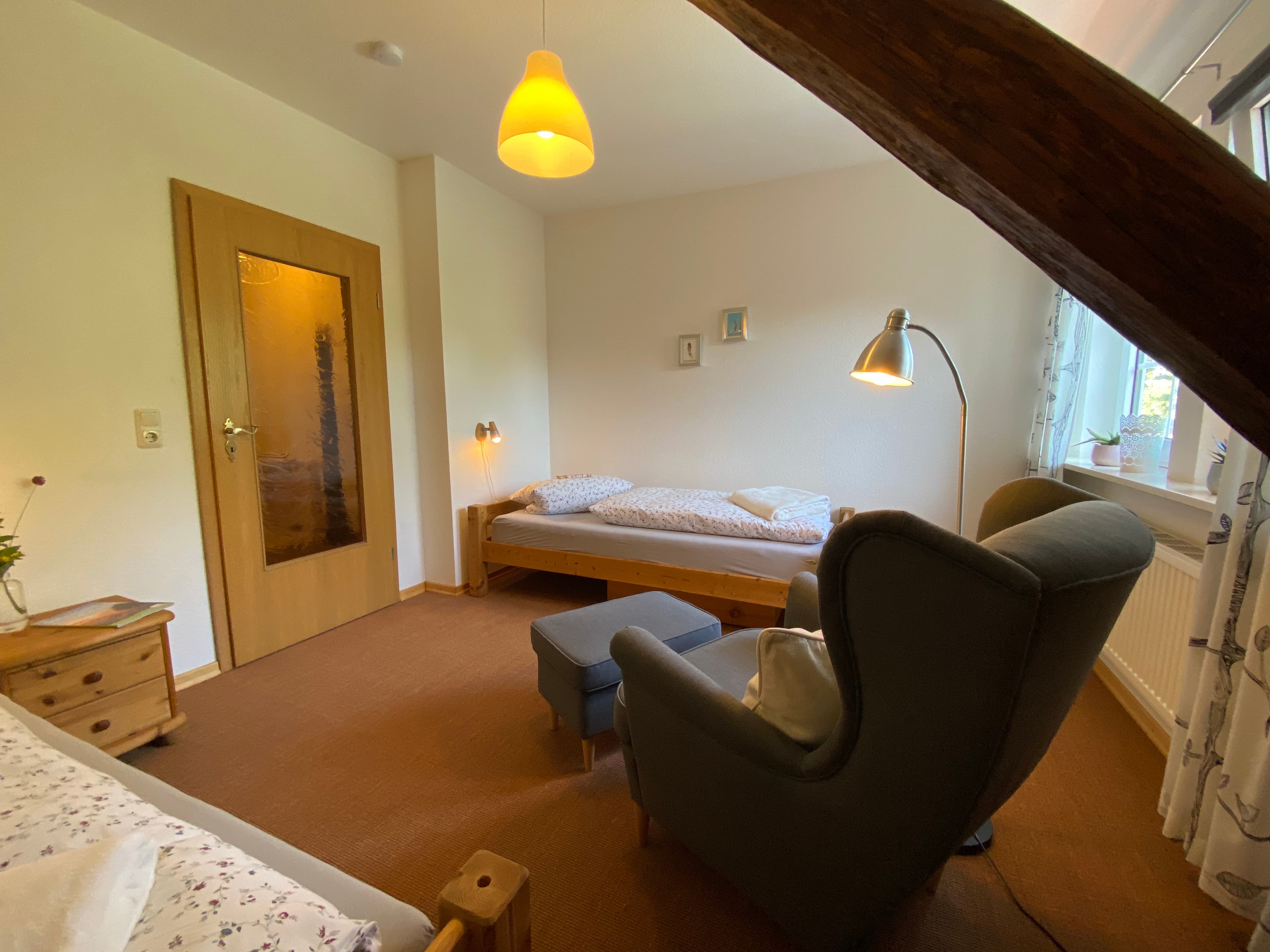Unsere Ferienwohnung mit separatem Eingang verfügt über zwei geräumige, helle Schlafzimmer. In einem der beiden Schlafzimmer ist ein schöner Fachwerkbalken freigelegt. Unser Wohnzimmer ist mit neuen schwarzen Polstermöbeln ausgestattet.