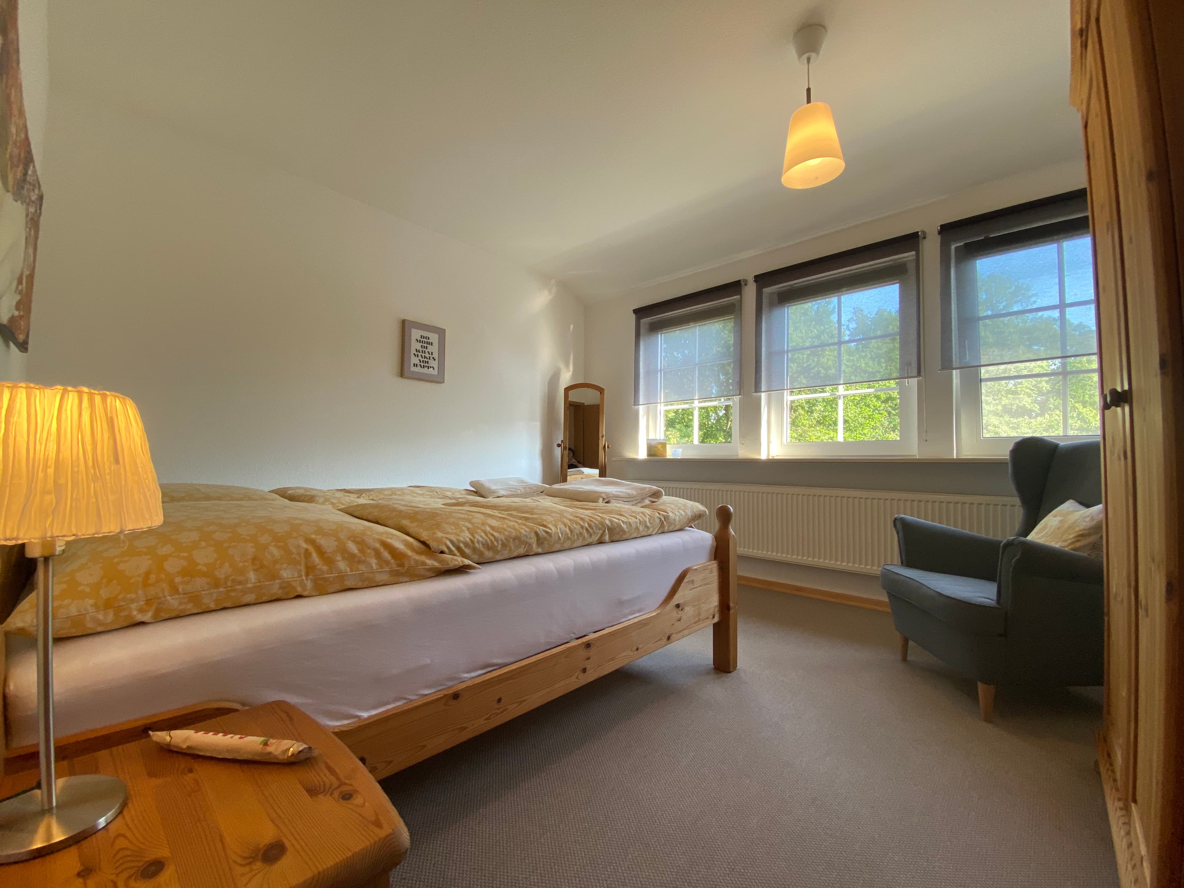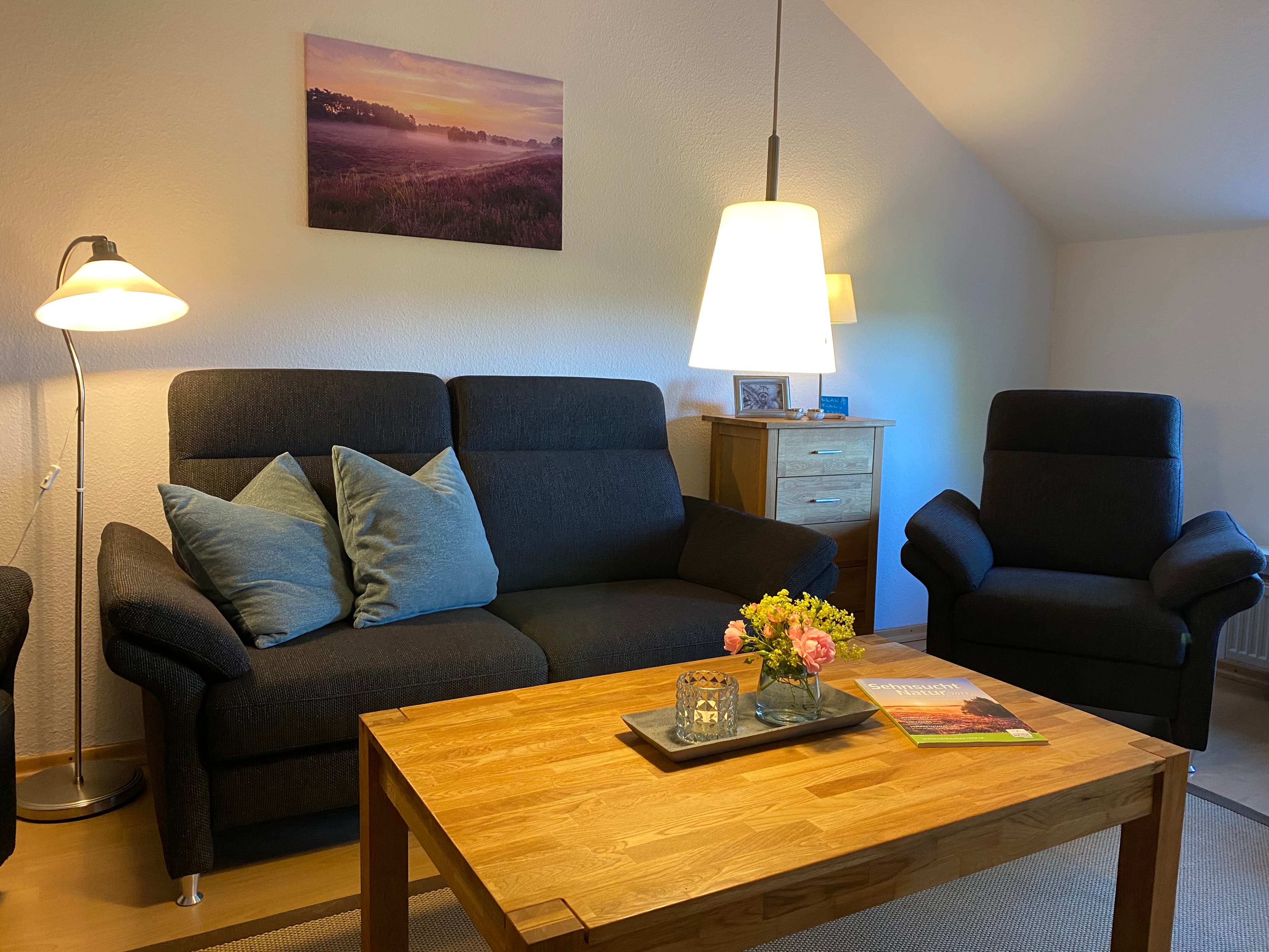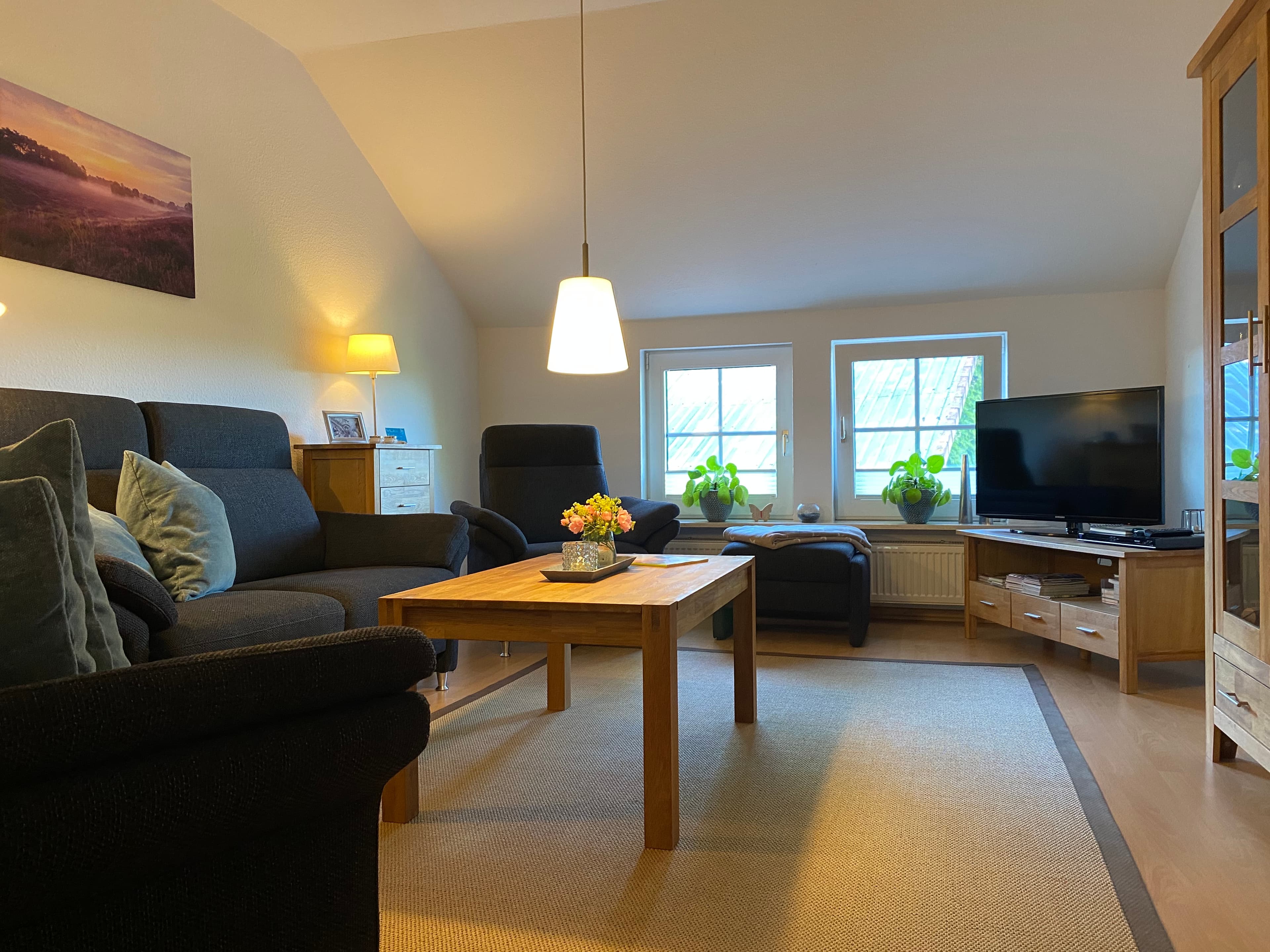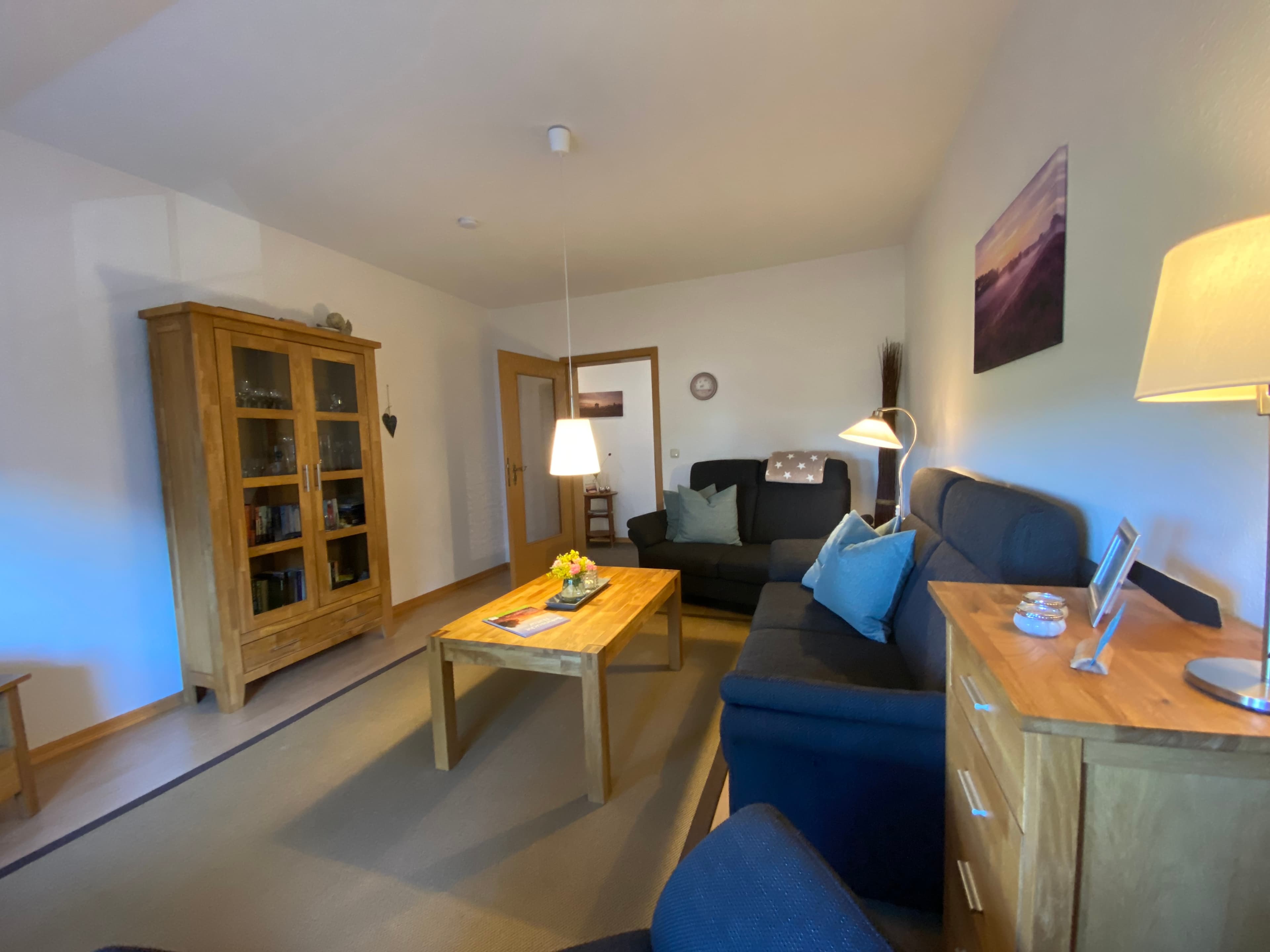 Unsere Ferienwohnung mit separatem Eingang verfügt über zwei geräumige, helle Schlafzimmer. In einem der beiden Schlafzimmer ist ein schöner Fachwerkbalken freigelegt. Unser Wohnzimmer ist mit neuen schwarzen Polstermöbeln ausgestattet.